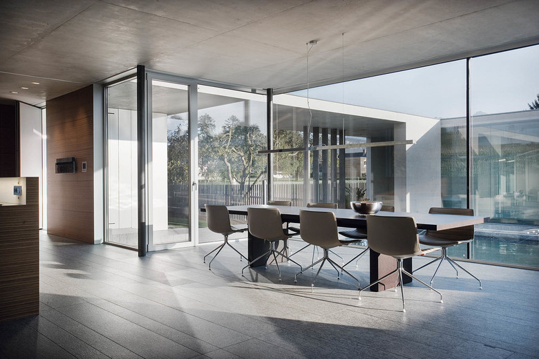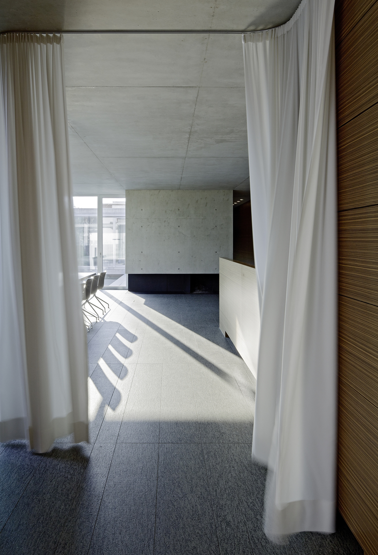 Das vielschichtige Innenleben der Betonskulptur wechselt zwischen hermetisch und transparent, verwehrt oder vermittelt zwischen Innen und Außen. Atmosphärische Raumschichten verschmelzen, sind da horizontal, da vertikal gefaßt. Die Architektur zeichnet ein leicht distanziertes, in Graugrüntöne getauchtes, präzises Bild. Detailperfektion ist bis in die letzte Fuge gefroren. Im Untergeschoß tut sich eine zweite Welt auf: dem umliegenden Erdreich abgerungene Höfe und Einschnitte belichten wohlproportionierte, introvertierte Räume. Im Technik- und Saunabereich glänzt licht die cremefarbene Epoxibeschichtung, entrückt bleibt die eigentliche Funktion.