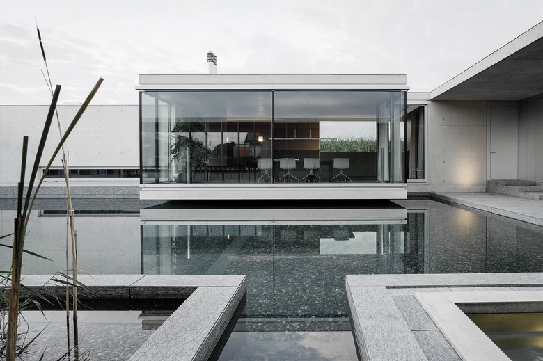 Den Bauherren, einem Ehepaar Mitte 40, fällt es nicht schwer der Idee vom unkonventionellen Wohnen nachzugeben, einem Wohnen durchtränkt von der Faszination des Wassers. Ankommen, verweilen, kochen, essen, kommunizieren, entspannen, verstauen, beschäftigen, pflegen, ankleiden, schlafen reihen sich gegen den Uhrzeigersinn um den Teich. Sensibel differenziert die Raumabfolge in Orientierung, Sichtbeziehung, Dimension und Lichteinfall. Allem gemein die rundumgereichten Wasserreflexe und die verbindliche Materialsprache: Sichtbeton, Granit, Zebranoholz, Aluminium und Glas.