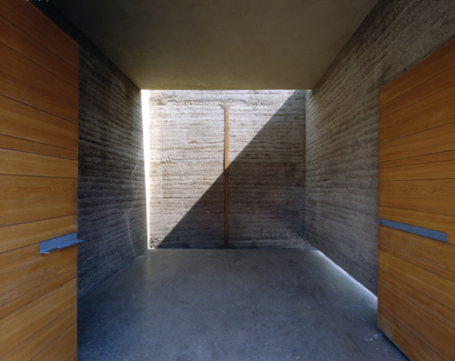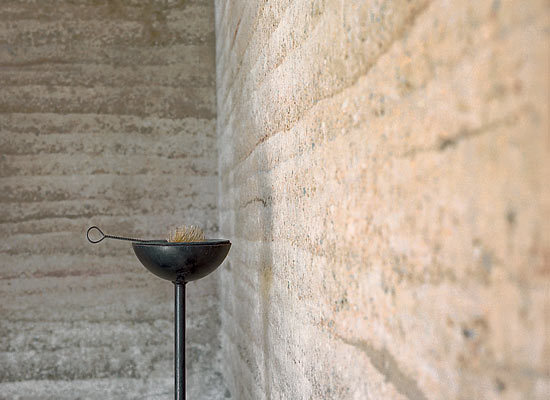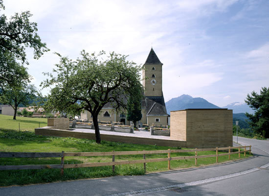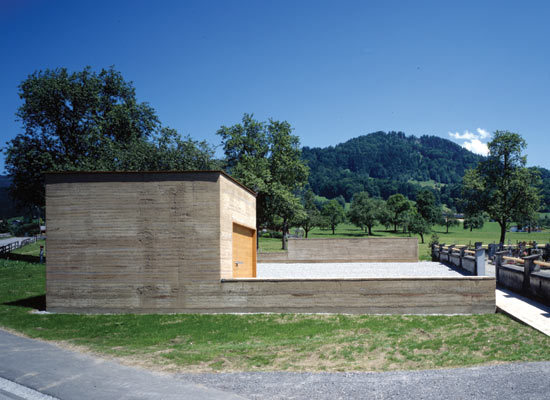 Die Friedhofserweiterung in Batschuns ist der gewagte Einsatz des gestampften Lehms für alle tragenden Bauteile und die daraus erwachsende sonderbare Anmut der Anlage, der vielleicht ursprünglich gar nicht explizit angestrebte Rekurs auf Vergänglichkeit. Das vom erfahrenen Schlinser Lehmbaumeister Martin Rauch, der diesem uralten Baumaterial über viele ansprechende Realisierungen eine unerwartete Aktualität in der Gegenwartsarchitektur zurückerobert hat, betreute Projekt, schert aus der pragmatischen Tendenz aus, in der die meisten Friedhofsanlagen nun rationalisiert angelegt werden.