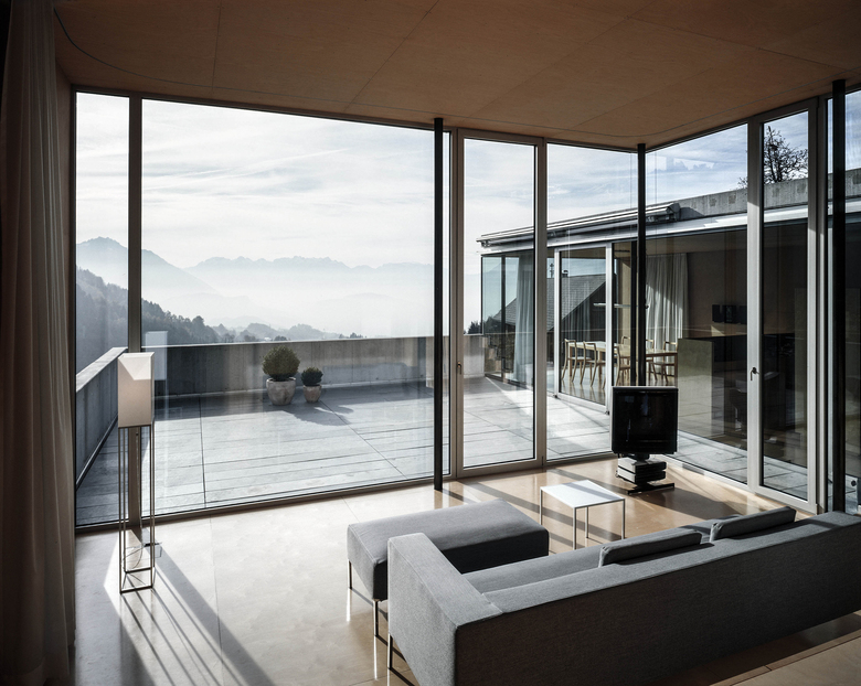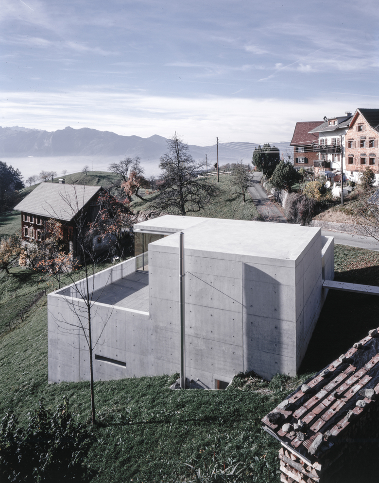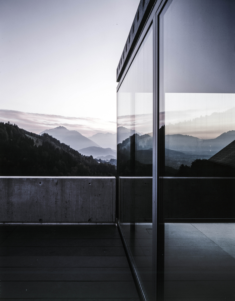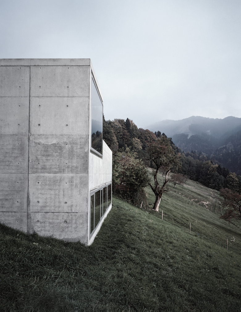 Das Haupthaus ist ein scharfkantiger zweigeschossiger Körper aus Sichtbeton, gelandet im steilen Hang wie ein Meteorit. Selbst die Aufsicht darauf gibt nichts anderes preis – die oberste Decke, vorgespannt und hydrophobiert, kommt ohne Dachfolie und Attika aus. Bündig und großformatig sind Glasflächen in Alu gerahmt, unterstreichen den hermetischen Charakter. Aus dem Sockel schälen sich die beiden Aufenthaltsräume – Kochen/Essen und Wohnen, der eine schmal und lang, der andere quadratisch und hoch. Schichten von Glas trennen und verbinden - die beiden Räume , obwohl auf gleichem Niveau, sind einer mediterranen Stadt gleich, durch eine Wege-, Platz-, Treppenanlage miteinander verbunden. Mit langem, flachem Tritt schwebt der Gast über ein paar Stufen in den lichtdurchfluteten Wohnraum.