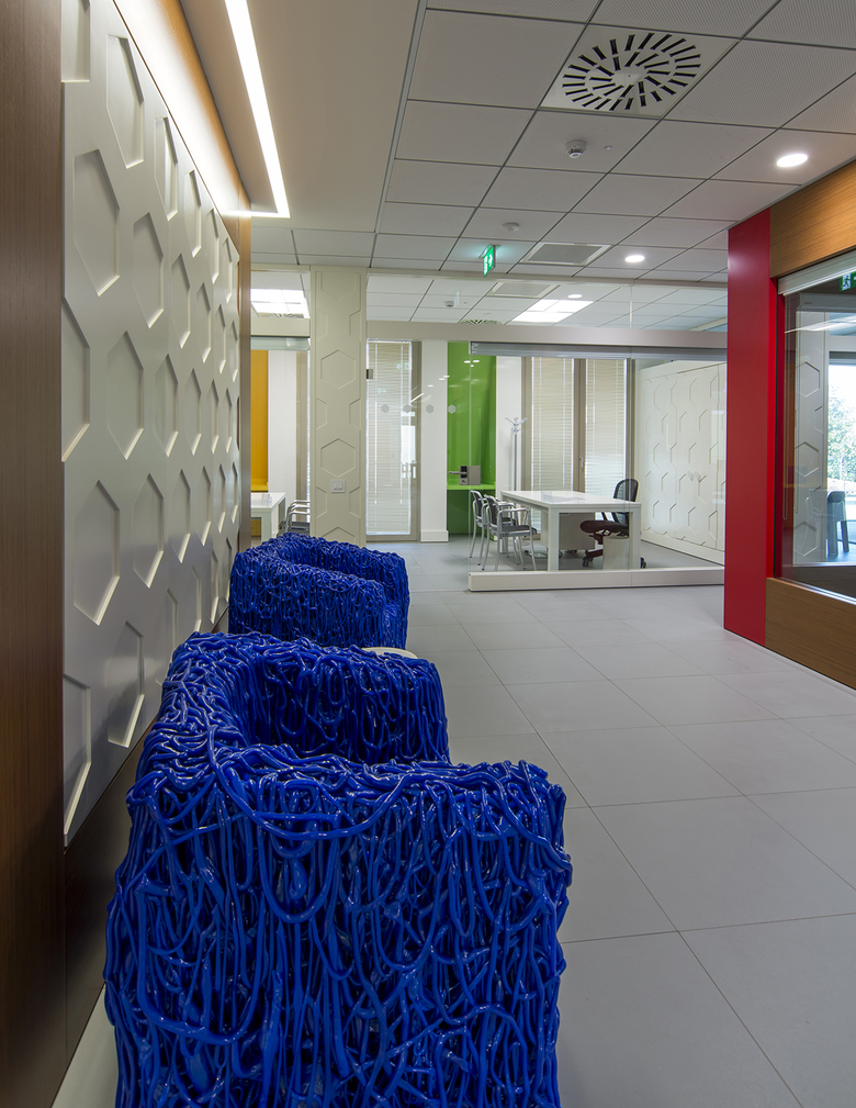 All’interno, lungo gli spazi di relazione e distribuzione, trovano spazio sedute e “pezzi” storici del design italiano, frutto di una selezione mirata (quasi curatoriale), che di fatto arricchisce l’edificio di una nuova collezione.