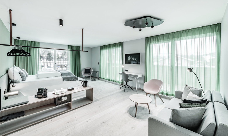 Die Gästezimmer sind universell anspruchsvoll bis ins letzte Detail gestaltet, mit einer kleinen Entspannungszone vor den Fenster und einem herrlichen Ausblick vom Daybed in die Bergwelt Tirols. So komfortabel wie zuhause, aber exklusive Stress und Alltagstrott. Der tägliche Emailcheck ist dank WLAN im Zimmer problemlos möglich. Wer auch im Urlaub arbeiten möchte, kann den kleinen Co-Working Bereich im Dachgeschoss nutzen. Für die anschließende Entspannung sorgt eine Boutiquesauna mit Panoramaruheraum und einer großen Dachterrasse.