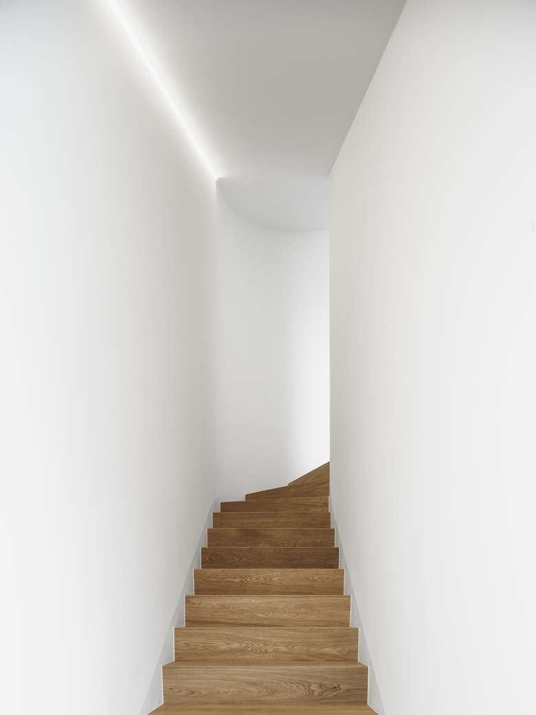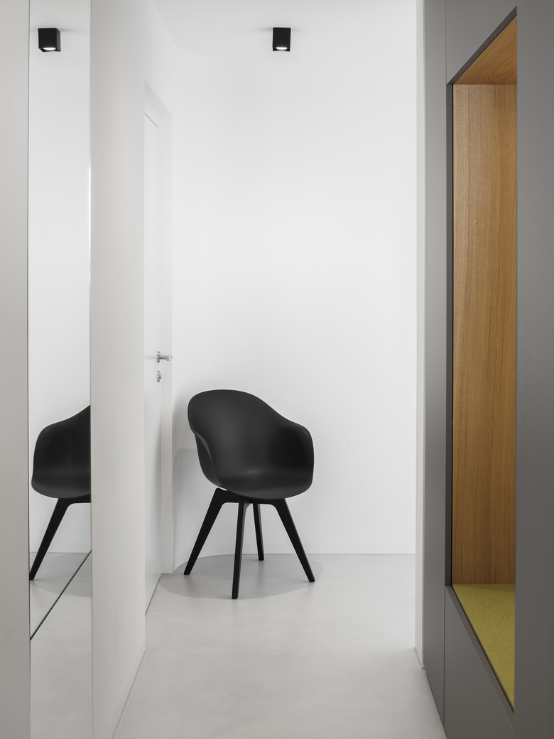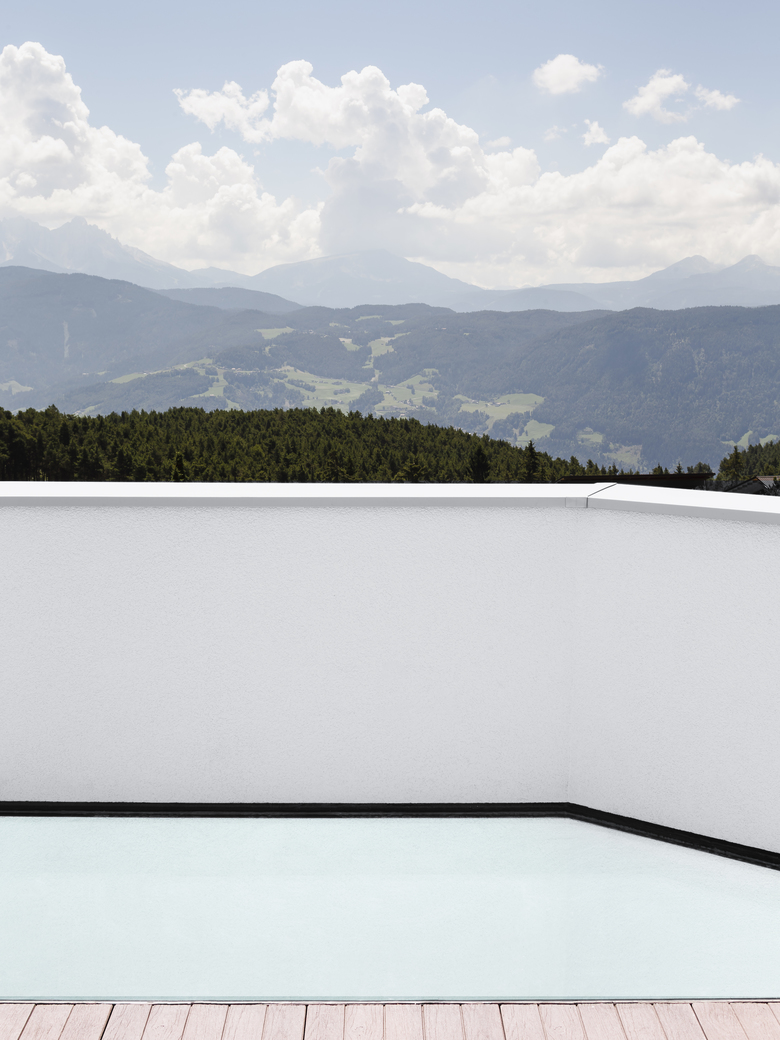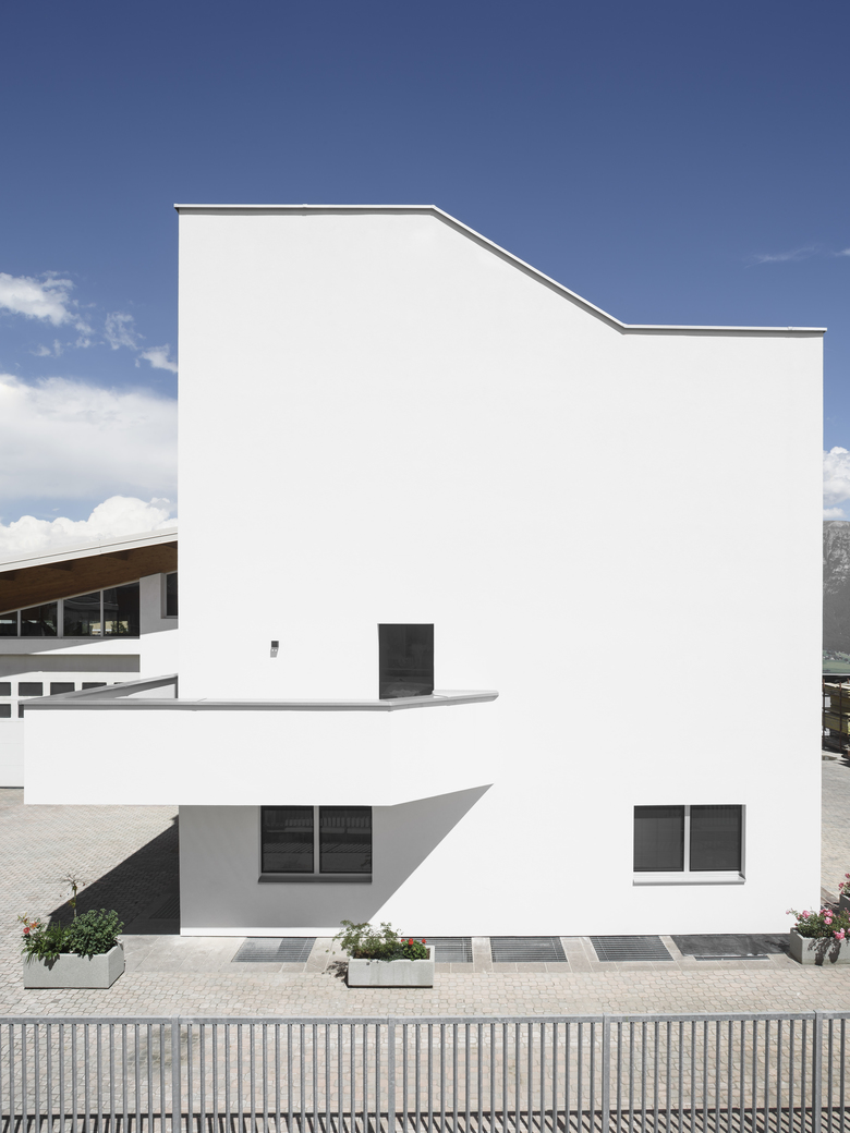 The project consists in the partial demolition and new erection of an existing but never completed house from the mid-nineties on the company's plot. The conversion includes the overhaul of the offices in the ground floor and the construction of an apartment in the first and second floor with a roof-deck. The removal of the gabled roof, the demolition of all partition walls and the modification of the existing apertures made way to redefine a new volume, which would match with the client's agenda. Starting point for the conceptual design was the restructuring of the vertical plot plan. The former perron, which from the forecourt led to the first floor, was replaced by an new interior staircase. The first floor hosts a wardrobe, a kitchen with dining corner, a bathroom, a utility room and a balcony on the south side. The second balcony, which is oriented to the north and west provides a weather shield for the office and apartment entrance on the ground floor. The second floor consists of the living room, the master bedroom, a nursery, a bathroom and a wardrobe. A wooden staircase leads to the roof-deck, which is canopied on its north side to provide shelter for a lounge and a small bar and trends to the south with a largely open view on the surrounding mountains. Two stirrups coin the south-façade, which evolve from the rectangular floor plan, forming a balcony on the first floor, a sunscreen above the living room and a viewing pulpit on the roof deck with a glazed floor panel. The turret-like building blends into the company's ensemble on its north side, is closed on its west side and opens up towards the south side with beautiful views on the dolomites.