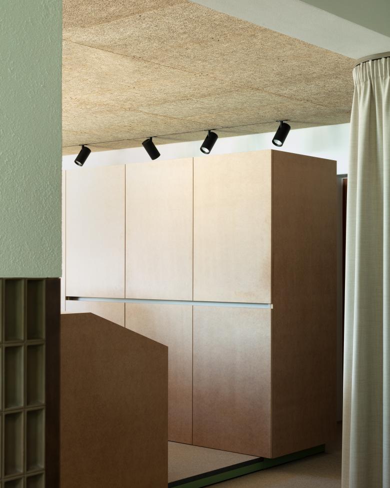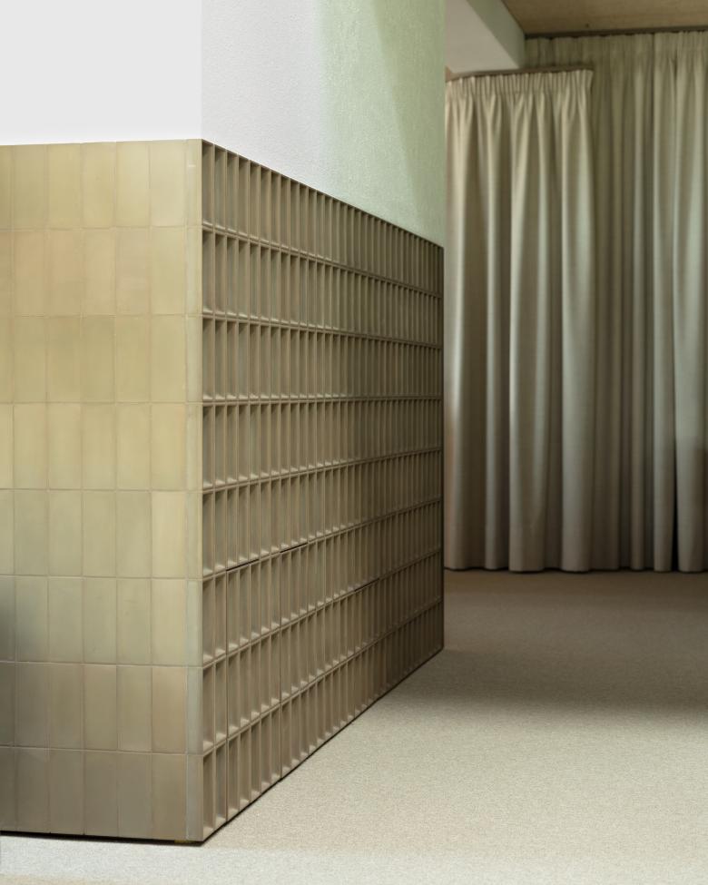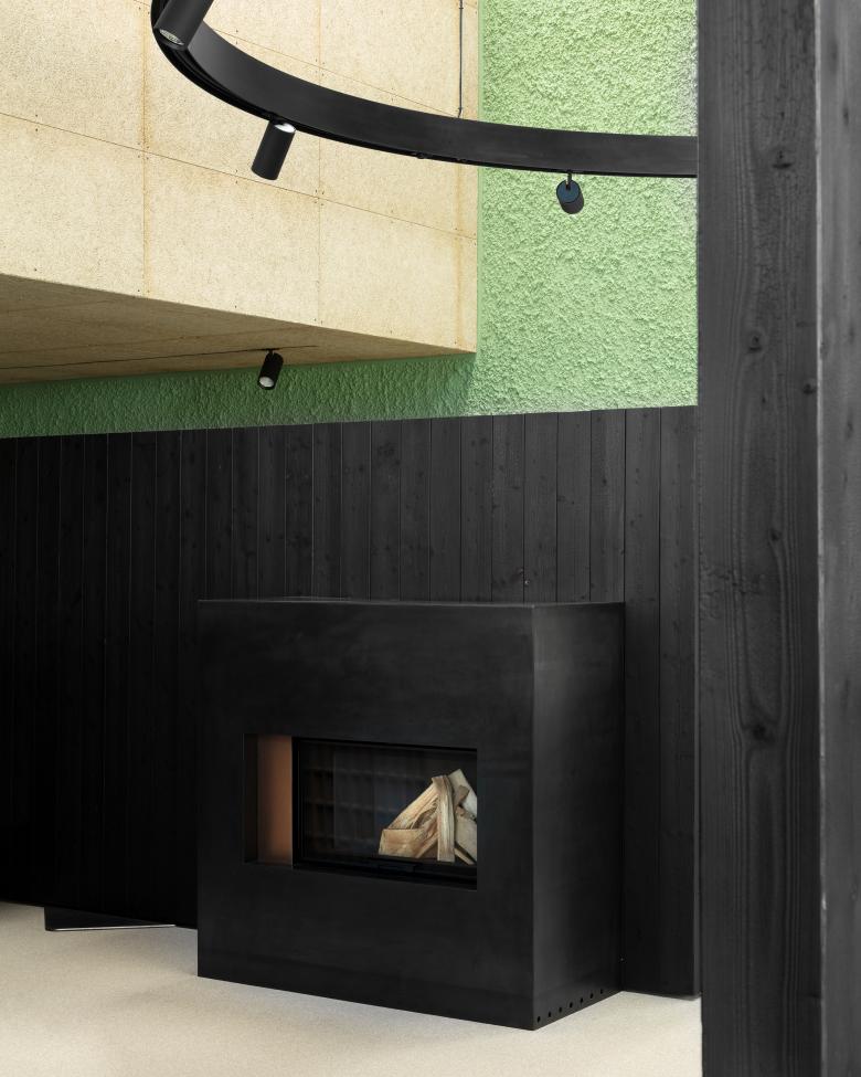 An ashen-colored carpeting, oiled MDF furniture, Heraklith ceiling and wall panels, a coarse green plaster and an interior roof structure painted in black elicit forever archaic motifs associated with fire. Suspended below the vaulted roof, two metal rings – painted black – illuminate the showroom, eliciting the cozy atmosphere of an open fireplace. The brass used for the logo, the exhaustion hood and the bar nook creates subtly glistening highlights.