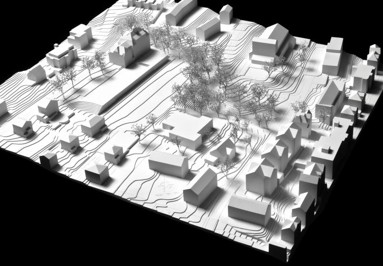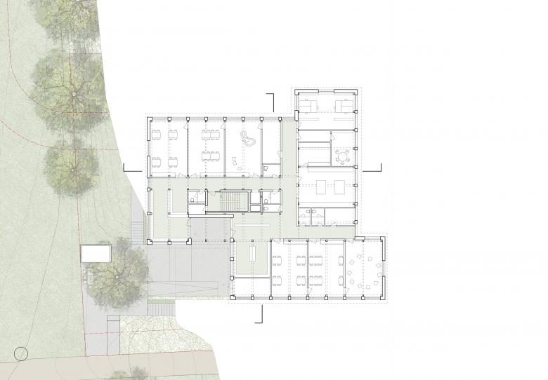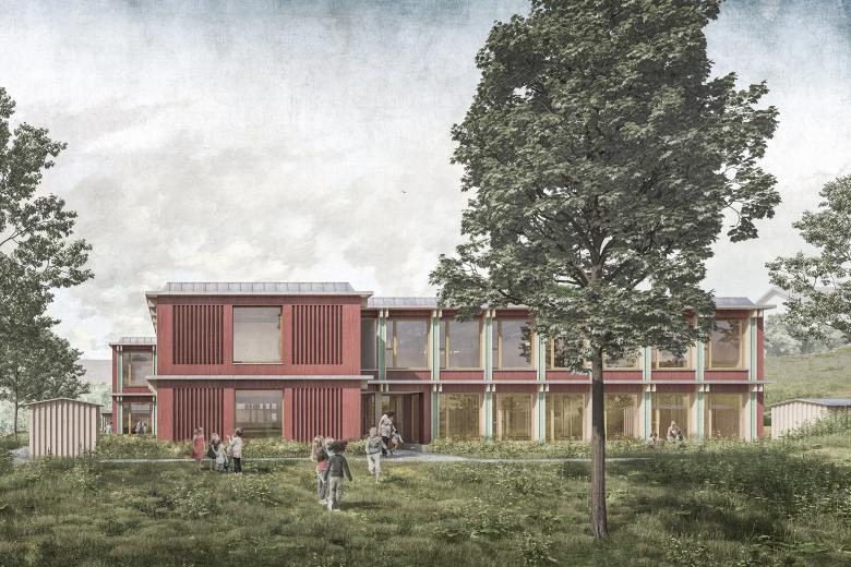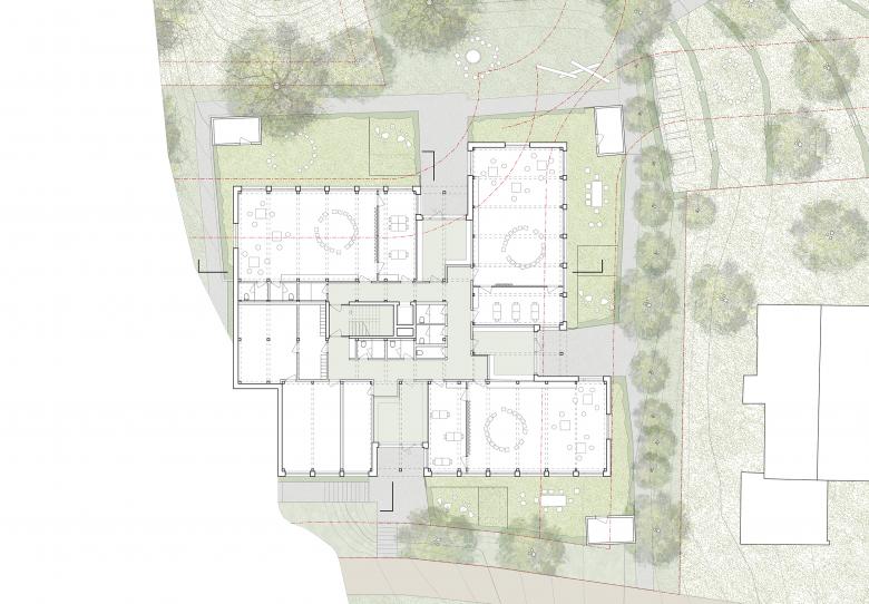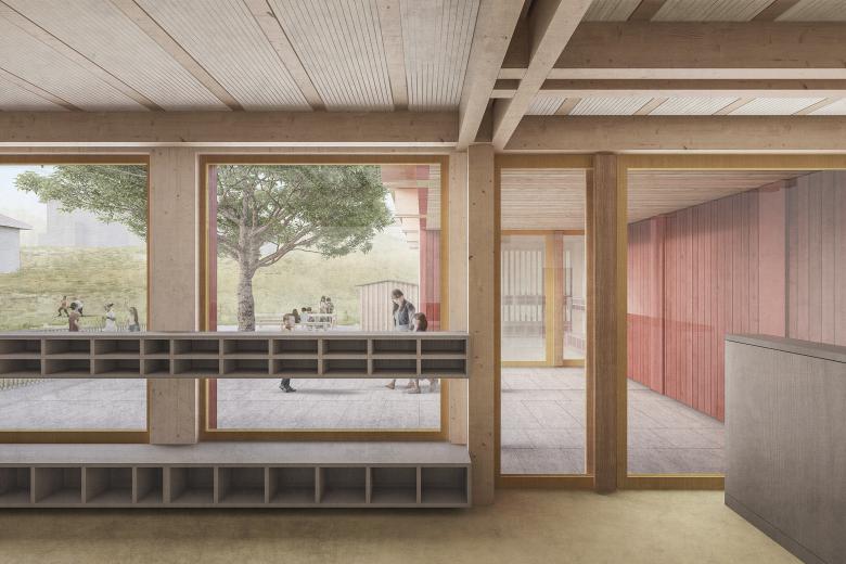 Das Gebäude wird auf zwei Ebenen organisiert, die untere dem Kindergarten und die obere der Tagesbetreuung zugewiesen. Die Topografie wird so genutzt, dass mit wenigen Terrainanpassungen auf beiden Ebenen ein ebenerdiger Zugang möglich wird. Die windmühlenartige Disposition der Kindergärten erlaubt es, jeder Einheit einen davor gelagerten Aussenraum mit eigenem Eingang zuzuordnen. Der imaginäre vierte ‘Arm’ der Windmühle wird so abgedreht, dass auf der oberen Ebene ein gefasster Vorplatz für die Tagesbetreuung entsteht, der sich in Richtung des Weges öffnet, wo der Schulbus anhält. Konstruktiv erinnert das Gebäude mit seiner feingliedrigen Holzstruktur an asiatische Pavillonbauten, bei denen Innen- und Aussenraum eng miteinander verwoben sind. Damit gliedert es sich selbstverständlich in die von der durchfliessenden Landschaft und dem benachbarten Wald mit dem Bachlauf geprägten Umgebung ein. Die Fassade besteht aus Holzverkleidungen, die den Rythmus der Gebäudestruktur aussen abbilden. Diese sind in Schlammfarben gestrichen und weisen eine fröhliche Farbigkeit auf.