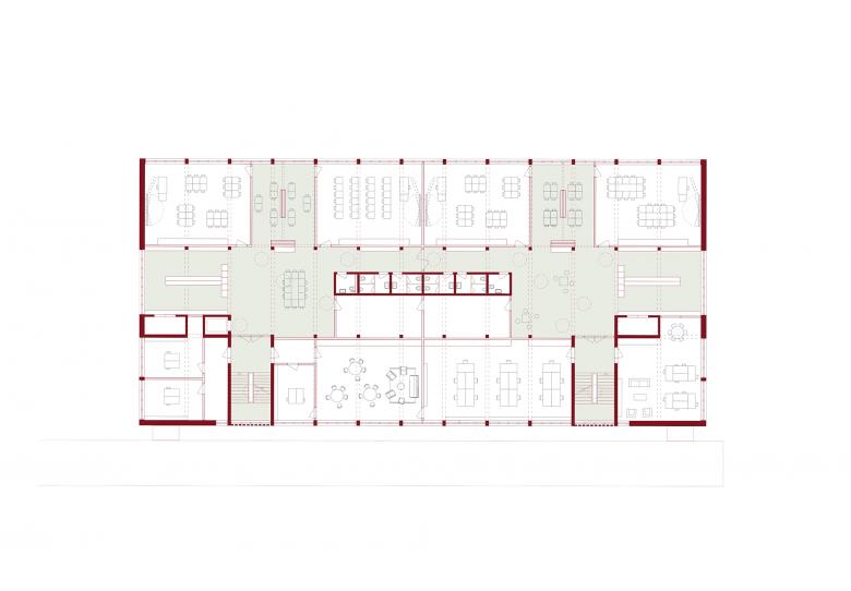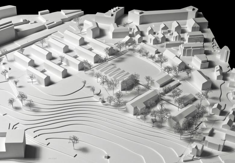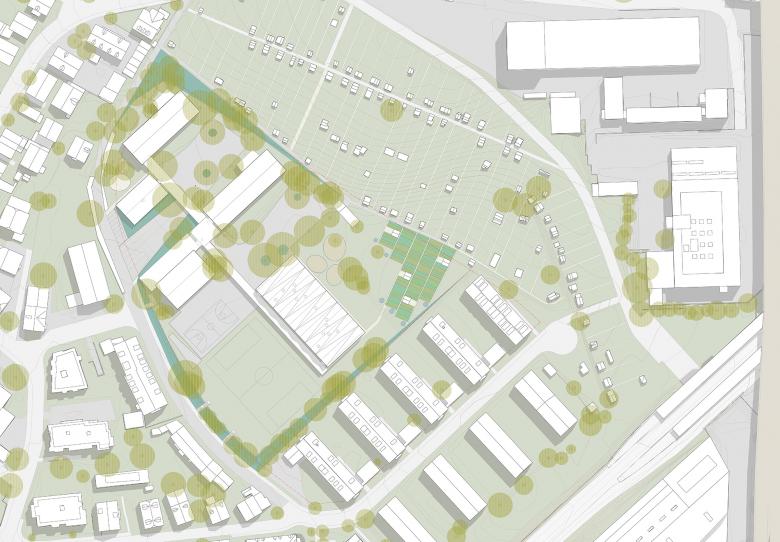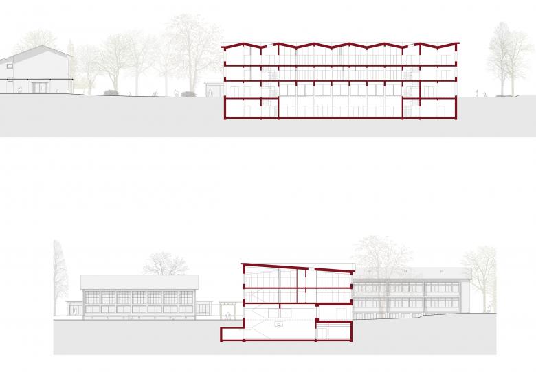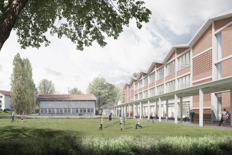 Das auf einem Plateau gelegene Schulareal weist eine Randbepflanzung mit Bäumen und Hecken auf. Fünf orthogonal angelegten Gebäude und eine Passerelle sind in diesen Raum eingefügt und bilden unterschiedlich proportionierte, gefasste Aussenräume. Die Anlage wird durch einen länglichen Neubau erweitert, der im Gegensatz zu den Bestandesbauten zweibündig organisiert und rechtwinklig dazu gesetzt ist. Die Passerelle wird verlängert, so entsteht eine gedeckte Verbindung zwischen allen Gebäuden. Der heute weite Freiraum im Süden wird in kleinere Kammern aufgeteilt und so das städtebauliche Prinzip weitergeführt. Der Neubau erhält ein gefaltetes Dach, das die Richtung der übrigen Dächer aufnimmt, wodurch eine Verwandtschaft entsteht.