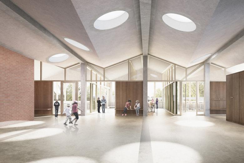 Die Raumstruktur der Obergeschosse im 1. und 2. Obergeschoss besteht aus je zwei Clustern mit eigenem Treppenhaus, in dessen Mitte sich eine Verteilhalle befindet, die als zusätzliches Raumangebot für den Unterricht dient. Erd- und Untergeschoss werden von der abgesenkten Turnhalle bestimmt. Die Anordnung der Eingangshallen ermöglicht einen vom Schulbetrieb unabhängigen Zugang zu Turnhalle und Mehrzweckraum.