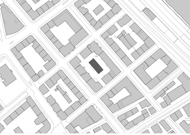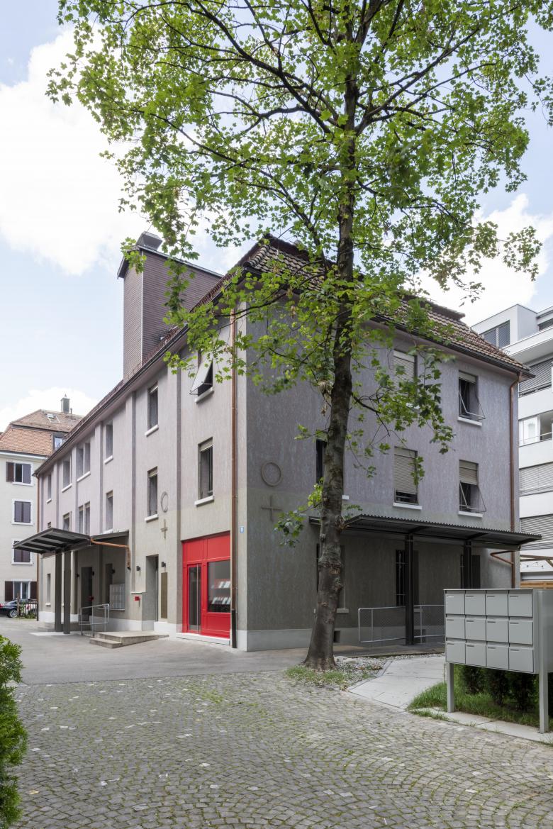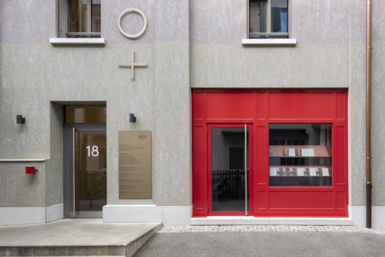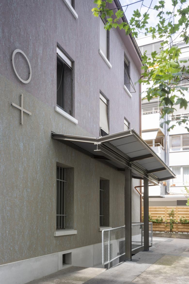 Die energetische Sanierung der Gebäudehülle umfasste den Fensterersatz, eine verputzte Aussenisolation und die Isolation des Estrichbodens. Beim Dach, das sich in gutem Zustand befand, wurde nur die Dacheindeckung punktuell ausgewechselt und die Regenrinnen, Fallrohre und Dachuntersicht erneuert. Die ehemaligen Konsolenvordächer mussten durch aussen abgestützte Vordächer ersetzt werden. Der architektonische Ausdruck der Fassade nimmt die Pfeilerstruktur des Lagerhauses auf, das Relief und die Fensterbänke werden nachgebildet und die rote Türfront, Wahrzeichen des Veranstaltungsraumes ‚Der Rote Raum‘, ist vom ehemaligen Garagentor inspiriert. Ziel der Oberflächengestaltung war es, eine textile Qualität und Tiefe durch Zweifarbigkeit zu erhalten. Es entsteht insgesamt eine elegante Wirkung, die dem öffentlichen Charakter des Gebäudes entspricht und es von den umliegenden Wohnliegenschaften abhebt.