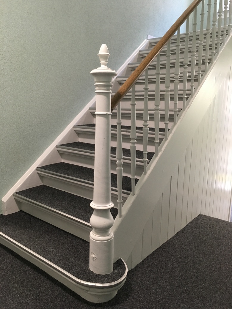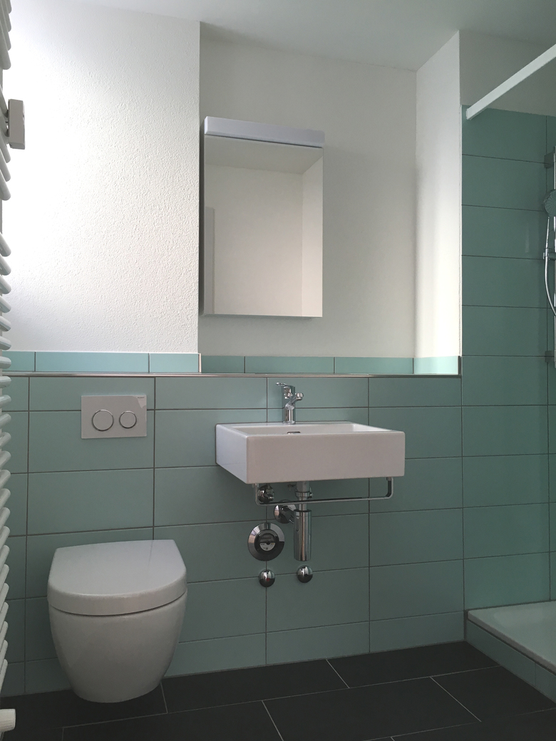 Das erarbeitete Farbkonzept bezieht sich auf die ursprünglichen Farben. Die Verbindung von innen und aussen mit den sanften blalugrünen Tönen findet sowohl bei den Fensterläden, der Treppenhaus- und Eingangswandfarbe wie auch bei den Fliessen der Nasszellen ihre Fortsetzung.