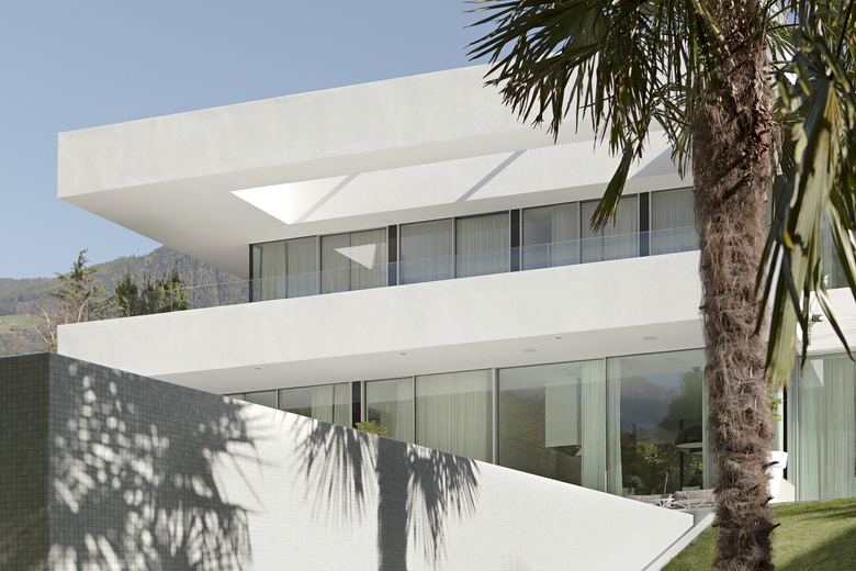 L’impostazione progettuale ideata dallo studio si ispira all’architettura moderna con volumi line- ari e grandi aperture vetrate che permettono di vivere senza soluzione di continuità spazi interni ed esterni. Ed è proprio il particolare clima mite di Merano, antica meta di villeggiatura frequentata da personaggi illustri come Franz Kafka o l'imperatrice Sissi, ad avere suggerito un’alternanza di spazi chiusi e aperti in continuità formale e funzionale con il giardino e l’area relax della piscina.