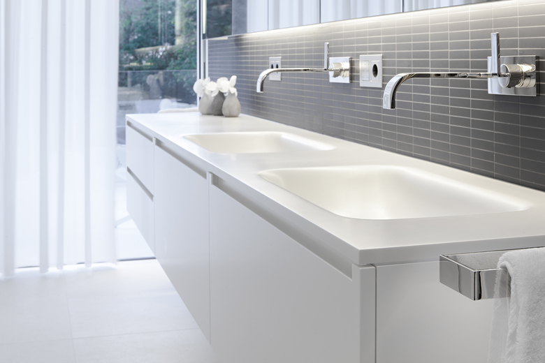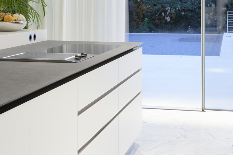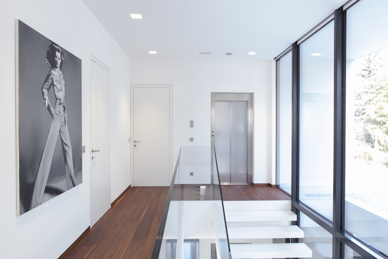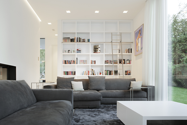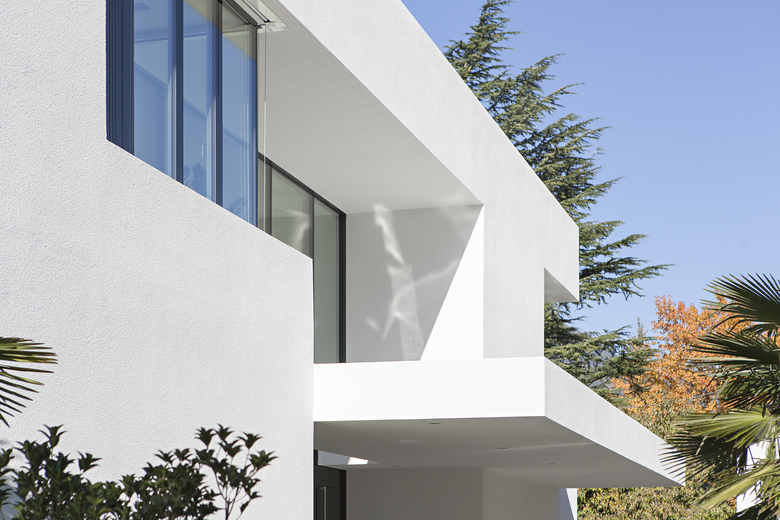 Per ottimizzare le performance energetiche, l’edificio è stato realizzato come un volume compatto distribuito su due piani fuori terra e uno interrato con una struttura in cemento armato dotato di uno strato tecnico isolante. Inoltre, le grandi aperture in vetro delle facciate sono state realizzate con pannelli triplo vetro per garantire un alto grado di isolamento termico e permettere il raggiungimento della classe A CasaClima. Seguendo la graduale pendenza del terreno, il piano terra della zona living grazie alle pareti vetrate e scorrevoli a tutta altezza trova un naturale collegamento con l’area relax della piscina e con il prato che circonda l’abitazione. L’orizzontalità e la trasparenza delle aperture scorrevoli è intervallata dai candidi volumi aggettanti del primo piano
