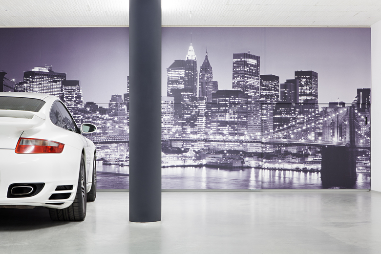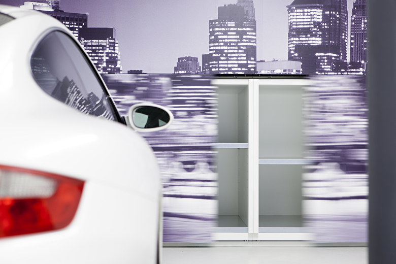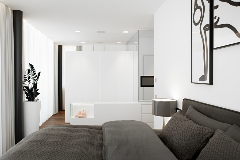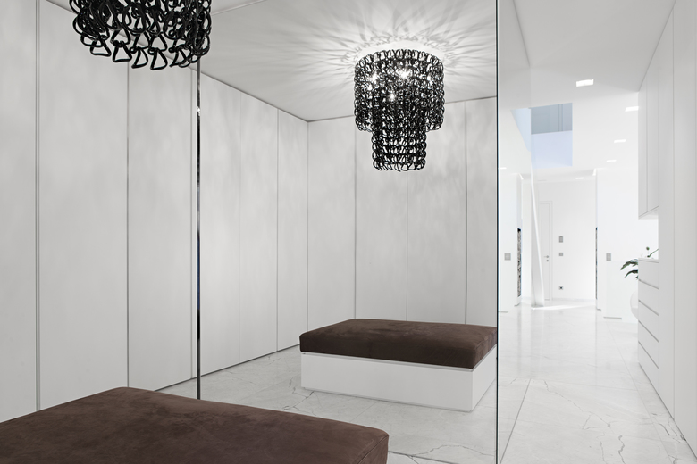 Gli interni sono dominati anch’essi dal bianco ottico delle pareti, degli arredi e delle superfici lucide in marmo che ampli- fica la vastità degli spazi. La struttura in cemento armato ha permesso infatti di evitare divisioni murarie interne sostituendole con pareti in vetro opaco e trasparente e un sistema di tende mobili che permette di ottenere gradi diversi di separazione e di privacy.
