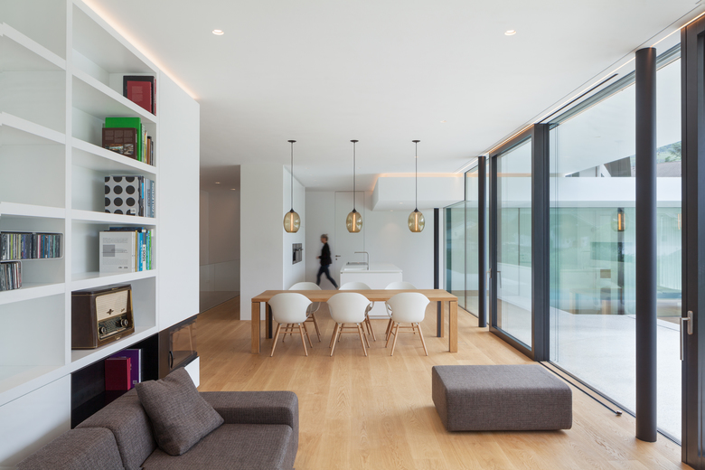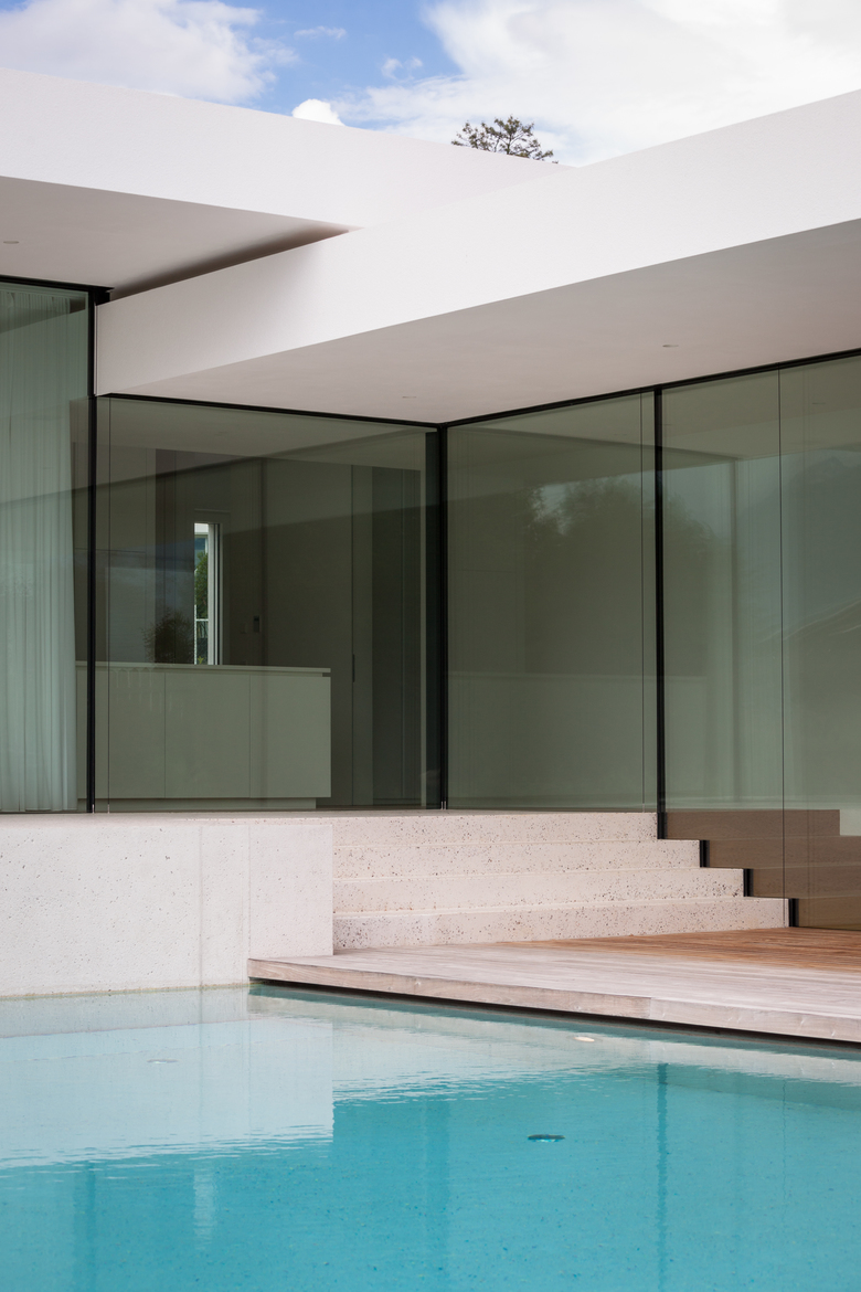 Il design della casa è puristico e questa semplicità viene sottolineata usando calcestruzzo in vista e realizzando facciate vetrate e un tetto piano coperto da ghiaia.