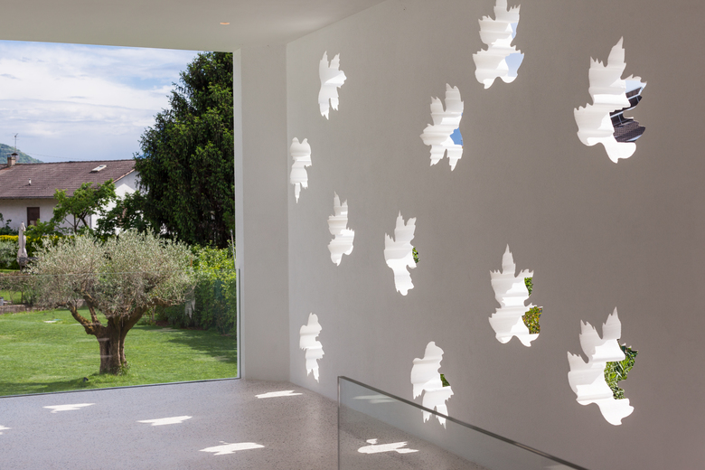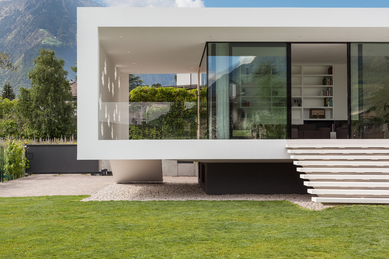 La casa T è una casa unifamiliare situata a Merano, composta da un pianterreno e un seminterrato con garage. Per adattare meglio la casa al terreno in pendenza, sono stati progettati due edifici a quote diverse uniti da gradini interni.