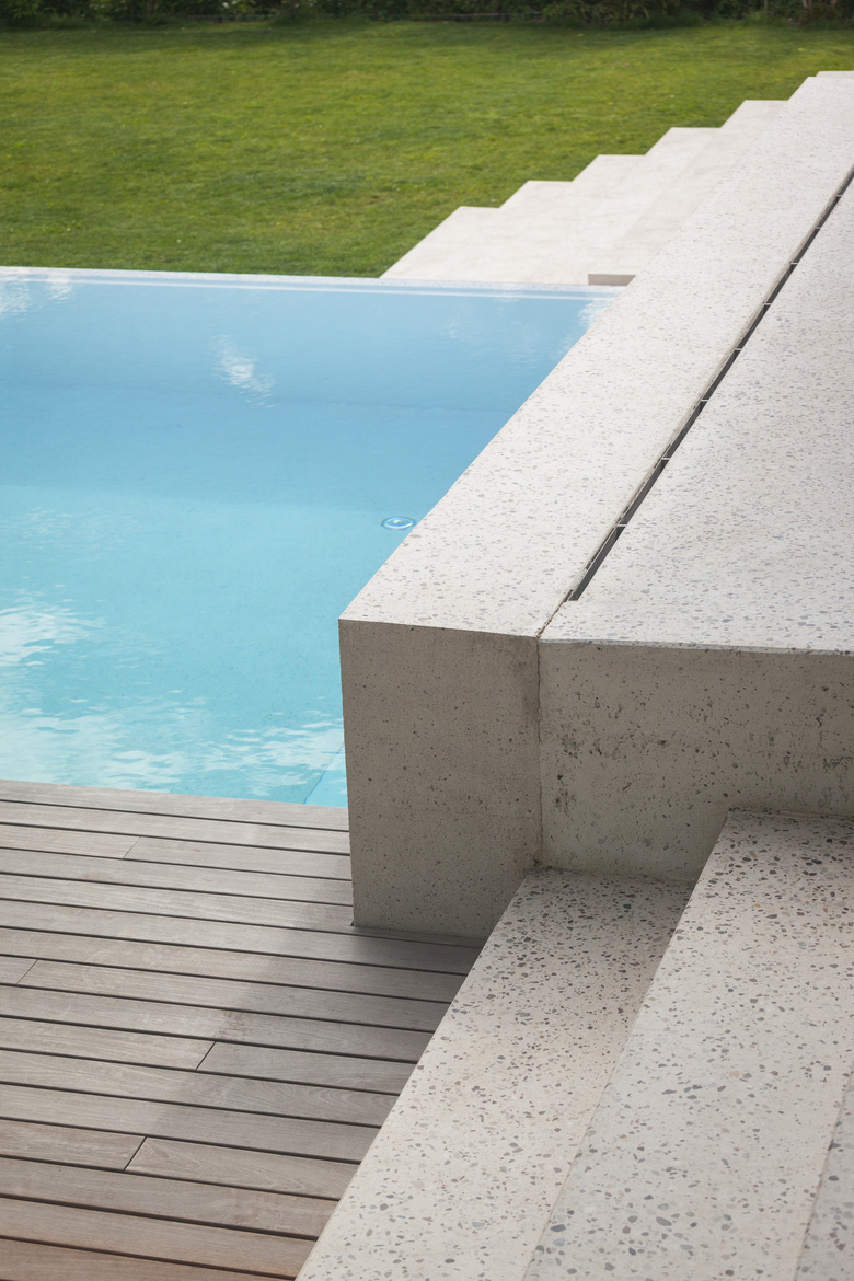 Le zone giorno si affacciano su una spaziosa terrazza e la piscina. Una scala galleggiante porta al giardino.