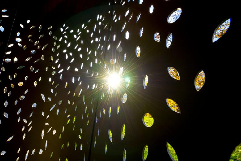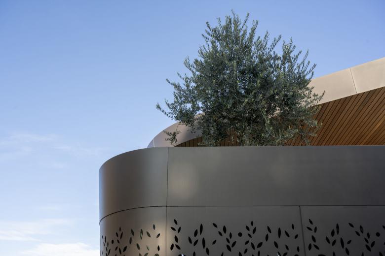 Inside, the spiral staircase in metal and wood that connects the ground and first floors is topped by a large oval skylight, clearly visible in the zenith view as symbiotic relationship between light and matter.