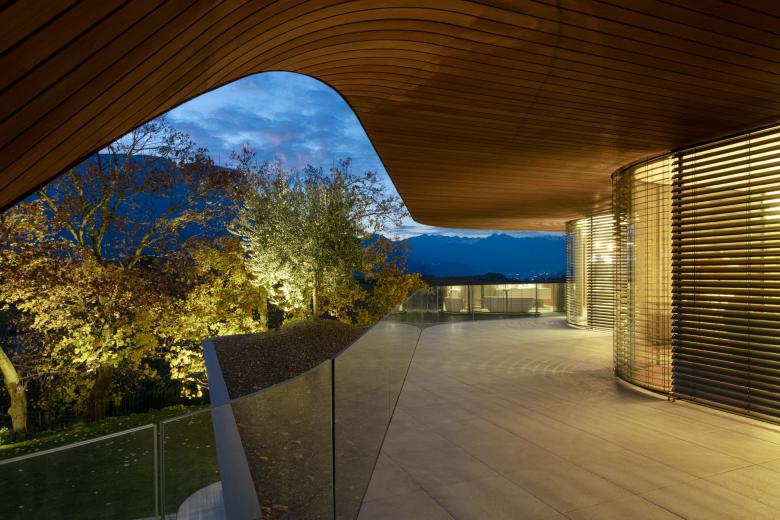 Outside, the glassed façades with large sliding doors on both floors provide access to the outside from almost every corner of the house: on the first floor to the covered terrace and on the ground floor to the garden that surrounds and wraps around the house up to the "infinity pool" facing the valley that leads from Bolzano to Merano.