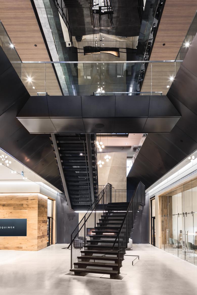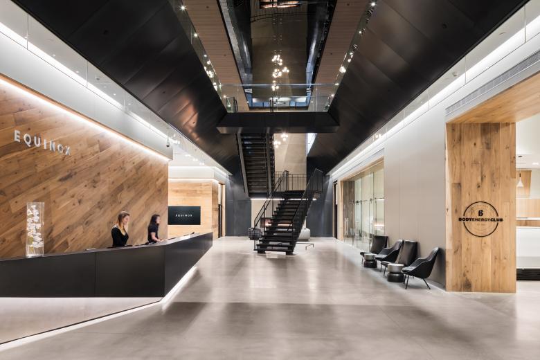 The design of this luxury fitness facility was developed around the concept of a sculpted canyon inspired by Vancouver’s architectural and natural landscapes. A bold, grand entry and lobby draws patrons in and establishes a strong visual connection between the clubs multiple floors. The grandeur of this central space is sharply contrasted by small, intimate coves throughout that become retreats for social interaction. Across from the prominent, blackened steel stair-core are the member services offices; glass boxes which allow for easy accessibility while maintaining privacy. The fireplace feature wall anchors the ground floor, creating an informal lounge space between the retail and fitness programs. Framed louvers at the storefront continue the importance of visual connectivity and grandeur, while allowing for additional light to penetrate the interior spaces. Rich, neutral materials of stone and wood create subtle texture throughout - returning to the conceptual canyon - while working to programmatically define spaces and guide patrons to main walkways.