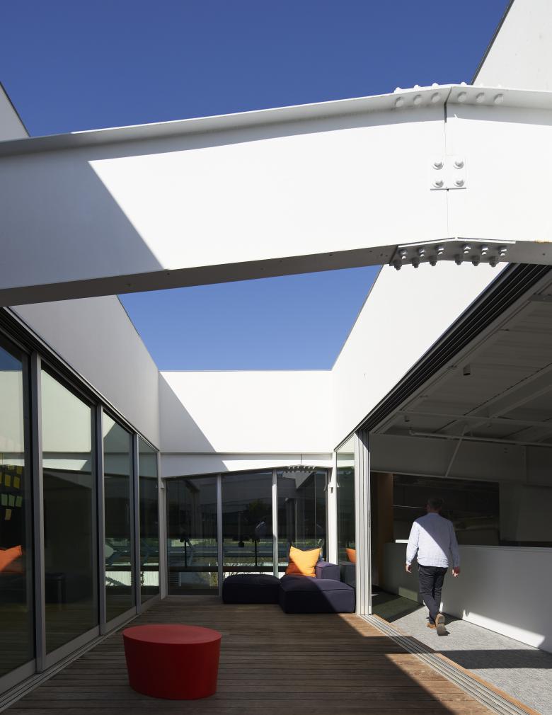 The main design gesture turns the previous unused exterior patio into a large, outdoor garden, which gets pulled through the workspace into the central courtyard on the second floor. The open-air enclosure filters light and greenery into previously dark, isolated spaces and offers a moment of reprieve from the industrious energy throughout.