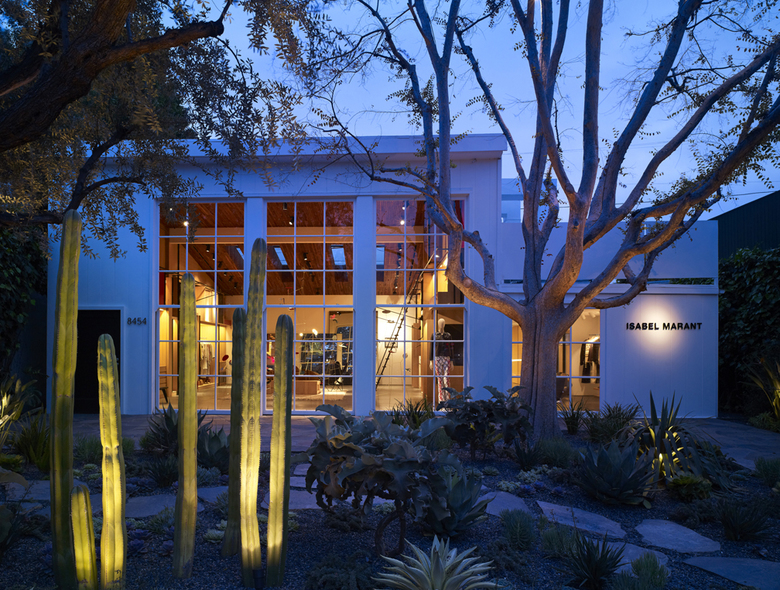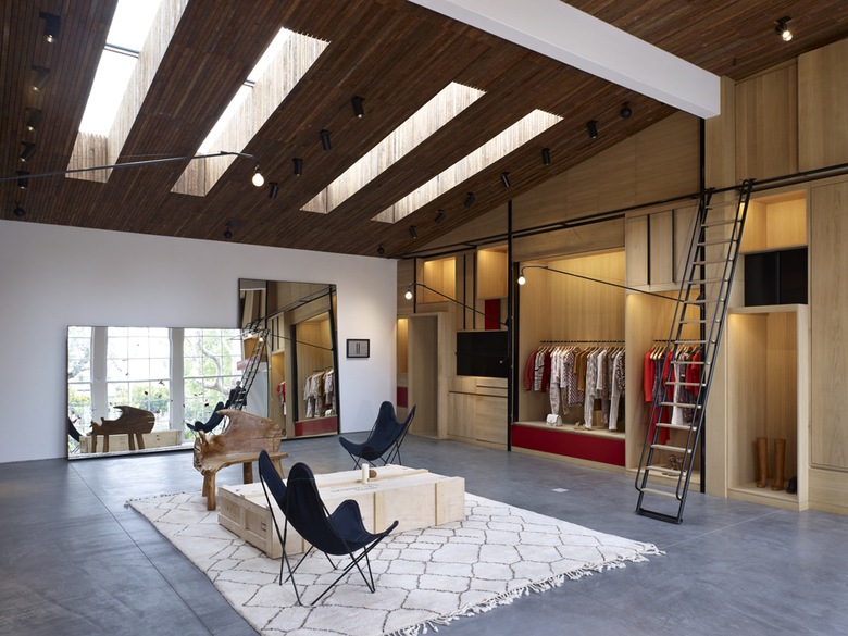 For only her second US boutique, Montalba Architects was selected as the Executive Architect, alongside Isabel Marant's in-house design team and Parisian architects Franklin Azzi Architecture, to create a space that feels simultaneously luxurious and laid back, the perfect blend of California modern and French bohemian. The gallery-like front-of-house takes advantage of the original wood structure, inserting several linear skylights between framing members, and bringing natural light deep into the interior. The large restored vertical-sliding windows reinforce the indoor-outdoor connection, opening up to a vast landscape of local desert plantings and wood decks. Inside, plywood paneling opens to reveal display nooks, or remains closed for art installations or to create a simple lounge area. Concrete floors and vintage lighting continue through to the tucked-away main retail floor and on to the back-of-house offices.