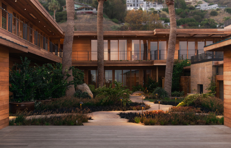 Located along the Pacific Coast Highway in Malibu, California, Nobu Ryokan is a completely renovated 1950s-era beach motel that combines the minimalist aesthetic of traditional Japanese inns with the cool elegance of the California coastline. A simple, veiled entrance opens onto an ocean-facing courtyard. around which the bungalows face. The different buildings are brought together with a unified palette, which flows seamlessly from outdoors to indoors: exterior limestone pavers become inlays in the reception area’s teak flooring, then turn vertically up the walls at the sculptural main entry stair and fireplace surround; built-in teak millwork in each of the 16 guestrooms suggests the lattice-like exposed cedar rafter ceiling; large wood and glazed doors and skylights bring natural light deep into the interiors of the suites. Integrated landscape elements push and pull against the building facade to create pocket gardens, while dramatic eaves and sliding wooden screens at the balconies and lower level courtyards provide shade and privacy for guests.