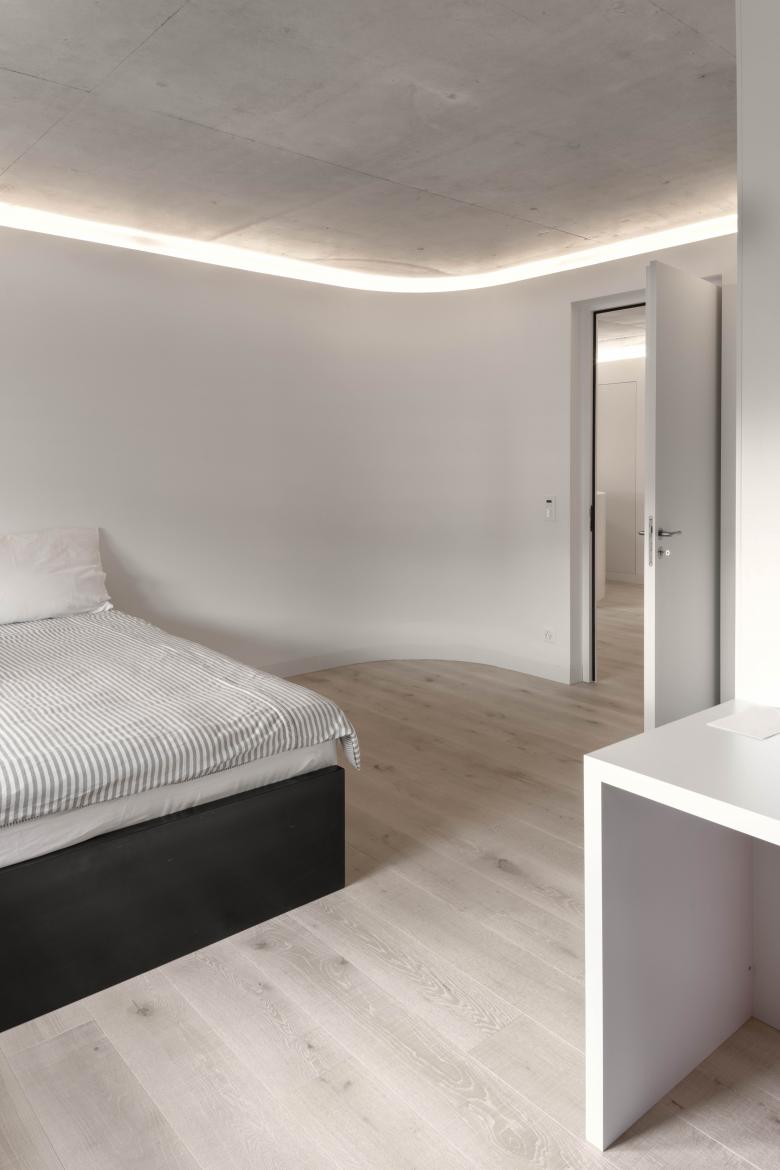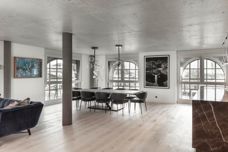 Located in the center of historical Vevey, Switzerland, Riviera Loft is a three-story residence set within an industrial building from the 1900s. Rich with texture and history, Riviera Loft was approached with the ambition to preserve the character of the industrial space while still allowing for updates and modern conveniences to accommodate a growing family. To achieve this duality, exterior walls were retained, and focus was placed on fostering a lightness within the interior. Solid walls were softened with rounded corners, and wherever possible, transparent glass was used to embrace natural light and open the space. Each level was designed to serve a specific purpose, with the first level dedicated to the living spaces, the second floor designed for the children's rooms and common space, and the third floor featuring the primary bedroom and bathrooms. A dramatic circular staircase connects all three levels together, reflecting, in form, the original circular window that lines the southern facade. A tonal palette of light oak wood, smoked glass, and black marble is used throughout to create a minimal backdrop for a curated furniture and art collection.