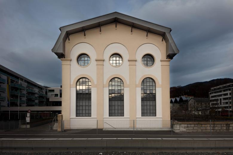 The building was originally built in 1842 for farm machinery repair and the production of mill wheels for presses. After the industrial revolution, and the arrival of the railway in 1861, the purpose of the building pivoted to manufacturing hydraulic turbines. In 1918, following the electrifying of the Swiss federal Railway network, a test station for hydraulic turbines to test propeller turbines was built, which was a new technology from the United States. The new turbine assembly workshop was designed by architect Ferdinand Kurz. The style is described as "regional baroque": "finely chiseled arched moldings subtly mimic colossal antique columns, framing semi-circular arches topped with oculi". Taking the form of a single 9500 m3 space, the building often saw changes of use throughout its history. It was in 1973 when turbines were entirely assembled in other buildings and the workshop was dedicated to "stainless steel boiler making", that the building became known as the "halle inox" (meaning the "stainless steel workshop").