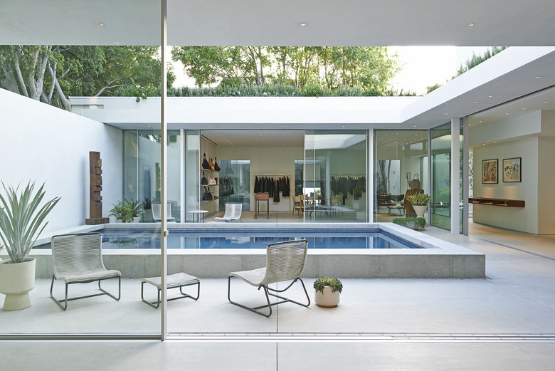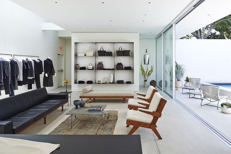The retailer’s first flagship store embodies the essence of California Modernism by blending interior and exterior spaces. The gallery-like interior is retail focused with a residential-infused spirit and includes sitting areas with fireplaces, foyer, galleries, and several distinct courtyards. Slipping through the double-height entry courtyard, customers are pulled through an over-scaled glass door featuring a custom bronze logo knob and into the foyer, which looks out onto the pool lounge. Natural light floods into the galleries flanking both sides of the pool through operable floor-to-ceiling structural glass doors and a new 25-foot-long skylight. Custom brushed stainless-steel garment rails line the edges of the space, complimented by custom steel-blade shelving for bags and shoes. Tung-oiled walnut display pieces inset with pigskin panels float in the hallways between the galleries and salon. The material palette reflects the brand’s curated aesthetic of polished minimalism and refined detailing, balancing natural textures-- walnut, antiqued limestone-- against matte white concrete, large expanses of minimally framed glass, and brushed metal finishes. A distinctive mid-century collection of furniture throughout , as well as lush native plantings, layer subtle color tones and warmth into the design.