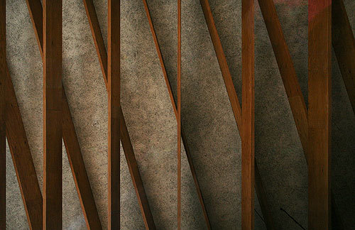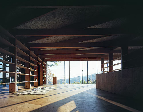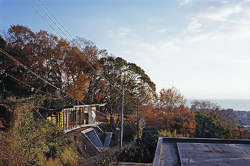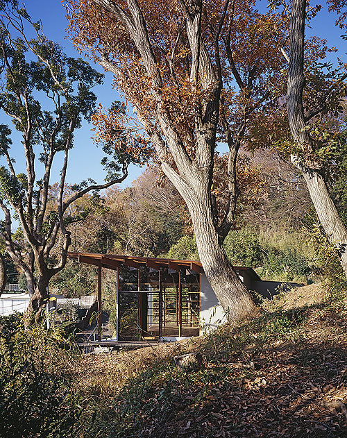 箱根の山々と小田原の平野部の交わる辺り、その山側に敷地はある。 以前は果樹が植えられていた明るい里山中腹の緩く傾斜する土地で、南側の遠方には相模湾を望み見晴らしがよいが、北風からは、背後の山が敷地を抱くようにして、これを遮ってくれている。周囲に茂る落葉性の広葉樹林は、夏には涼しい葉影を作り、冬には自ら葉を落として少ない日光を地面にまで届け、山の水気を含んだ土を暖めている。そんな、人の居住に適した環境特性が、しずかに見つけられるのを待っているような敷地だった。 ここで建築家がやるべきことは、「家」を成立させる為に、「土地」に由来しない原理を新たに持ち込むのではなく、既に「土地」が持っている潜在的な「居住のポテンシャル」を引き出し、人の「住処」として十分な程度に、これを整理し増幅することであると考えた。つまり、そこにある「土地」が、全てを秩序づけているような状態として、建築を構成することを目指したのである。 そこで我々は、フレームを立て、屋根を架ける、という建築の最も根源的な要素にまでデザイン上の操作を還元し、これらの決定を「土地に委ねる」ことにした。 具体的には2組の全長12m程の門型フレームセットが用意され、これを緩くカーブする土地形状が要求する通りに、若干の角度を保って重ねて配置することで、中間スパンにトラスを持つ架構体が形成された。フレームはLVL-38×286mmでできているが、弱軸方向への水平力は天井面に形成されるトラス剛面で背後のコアにまで効率よく伝達されるため、その極薄のプロポーションで成立している(中間の梁の交点は6.3mという大スパンでの梁たわみを抑制してもいる)。また、このフィン状の柱は間に棚板を挟むことで半透過の仕切りとして空間を穏やかに分節してもいる。 更に、各梁はこの土地に降る雨量を壁面外へと捌くに十分な勾配を持った屋根を受ける為、それぞれ南から北へ順に下っていくので、高さ方向の変化がおこり、地形がもたらす平面的な角度と併せて、複合的な住行為が必要とする「偏り」が空間に付与されることになった。 以上のように、地形と雨量という土地の特性が、この建築に特別な「ジオメトリ」を与え、これが構造・空間を同時に決定し、また調和さしめている。 その語源通り、土地(=geo)を、詳しく測る(=metria)ことで、建築の秩序(=geometry)が定められる場合、当然ながら、これによって生み出される建築は、明晰な秩序を持ちながらも、同時に土地との連続性を保持することになる。 「土地をよく観察し、そこに潜在するジオメトリを見出すこと」 これが我々が行なったデザイン行為の本質であり、ほとんど全てと言っていい。