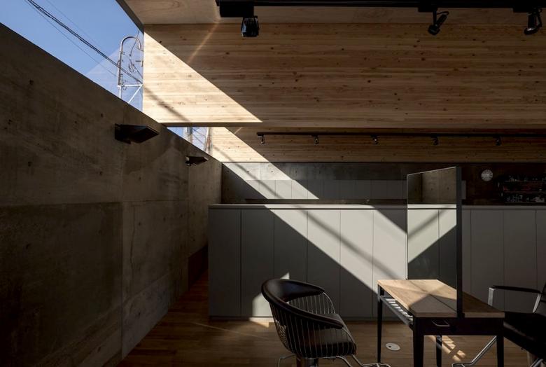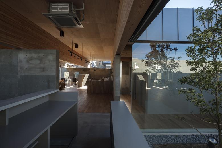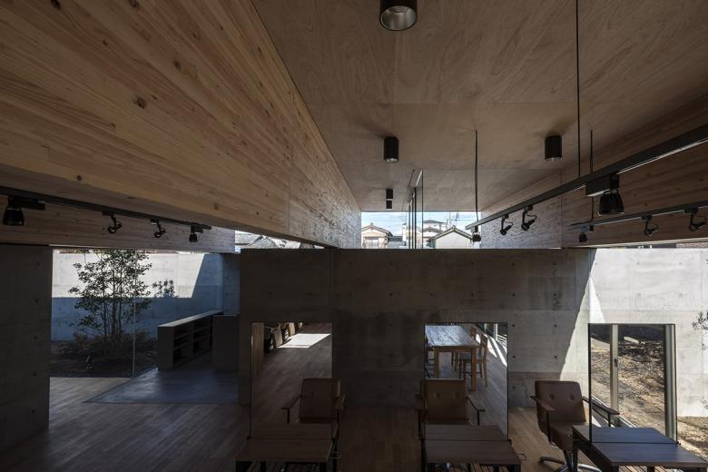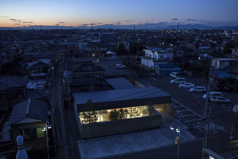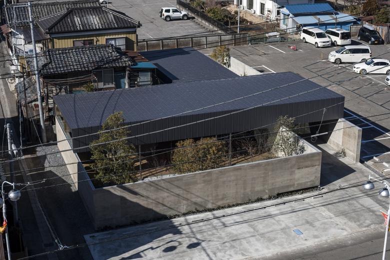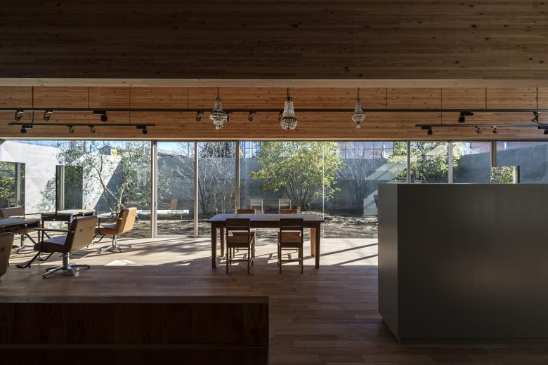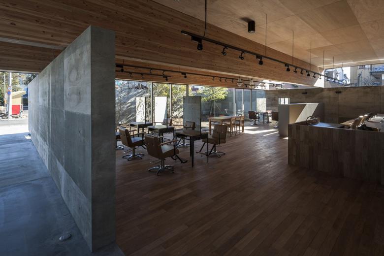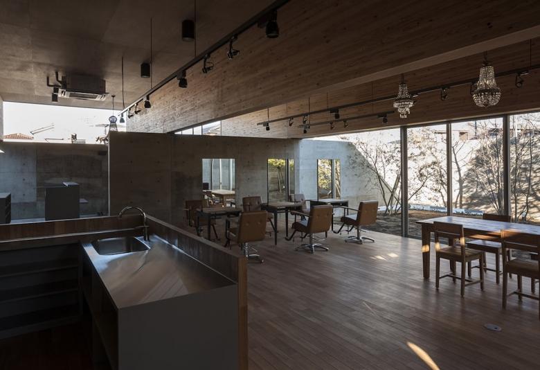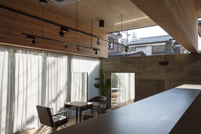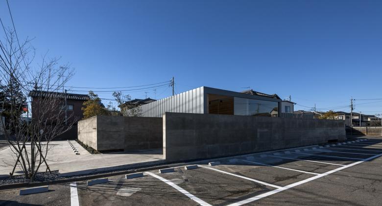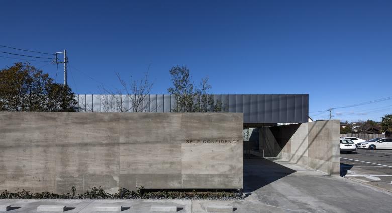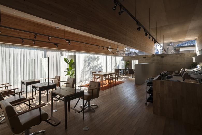 人口10万人程の北関東の地方都市に敷地はある。駅から徒歩5分程の立地だけれど、周囲は低層の商店や駐車場がほとんどで、そこに4・5層の商業ビルがまばらに建っている程度だ。いわゆる地方都市の漠然とした風景が、北関東特有の透明な青空の下に低く広がっているような地域である。この土地出身のクライアントは地域で最も高く評価されている美容師で、これまではテナントビルの一画で営業をしてきたが、更なる発展と、地域の永続的な文化拠点となることを願って、独立の美容室の設計を依頼してきた。