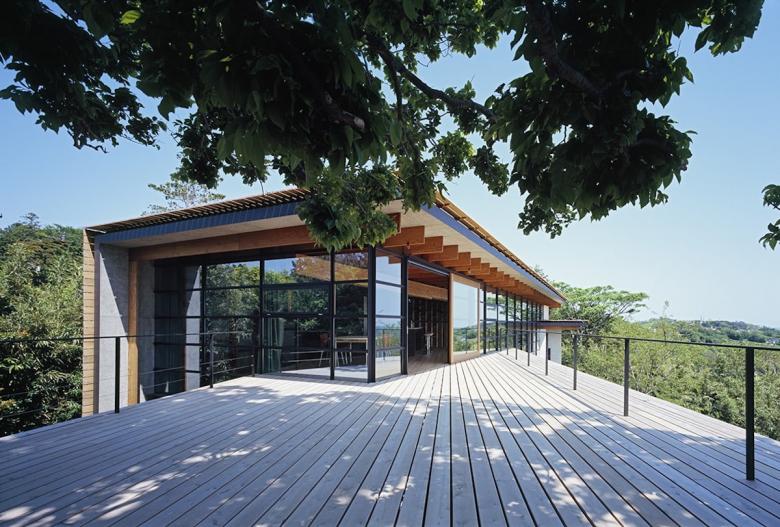 真鶴半島の付け根近く、南へ向かって下っていく丘陵地が、いったん勾配を緩める肩のような地形上に敷地はある。周囲を取りかこむ広葉樹を中心とした雑木林の向こうには、太平洋がおおきく静かに広がっている。ここに家族とその友人達が週末を過ごすゲストハウスを、というのが施主の希望だった。