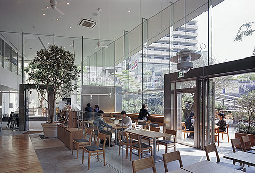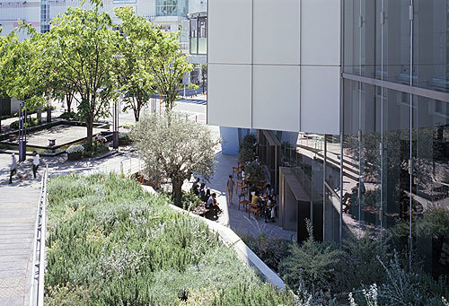 たとえば、異なるレベルにある2つの既存パブリックスペー スの「シンボル広場」や「噴水広場」は、ハコ下の軒先的な中間領域によって商業空間と密接に関係づけられ、テナントで買ったパイを広場の段差に腰掛けて食 べているカップルがいたり、それを眺めながらカフェで寛ぐといったような相互関係が数多く生み出され、それぞれの活用の度合いは相乗的に高められている。 また、そういった2つのグランドレベルの賑わいは全層を吹き抜けるアトリウムを介して上層階にまで伝えられ、ガラススキンによって外部に開かれた景観や、 都市を見下ろすハコ上のテラスの効果等と合わせて、上層階においても都市と商業空間は強く関係づけられている。