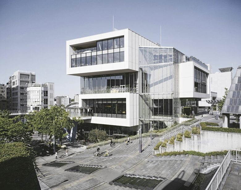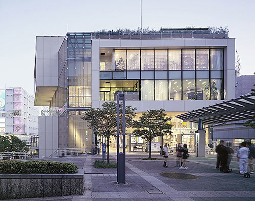 そこで用意したのは「4つのハコを互い違いに積み重ね、これを透明なガラススキンでラフに覆う」とい う、単純な「構成」である。この「構成」によって従来の「外/内」という対立の図式が「ハコ外・外部」/「ハコ外・内部」/「ハコ内・外部」/「ハコ内・ 内部」という内外が入り交じった関係へと細分化され、都市と建築が滑らかに連続する事になった。