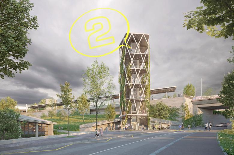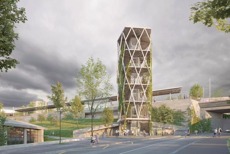 Das neue Verbindungsbauwerk ist das Portal zu zwei Bahnhöfen und bildet die Adresse des Quartiers Haggen am Fuss des Hügelzugs. Der Lift- und Treppenturm ist als identitätsstiftendes Zeichen weithin sichtbar. Im Norden liegt der grosszügig dimensionierte Dreiecksplatz, über den die Wegverbindungen an die nahe gelegene Bushaltestelle und ans Quartier Bruggen angeschlossen wird.