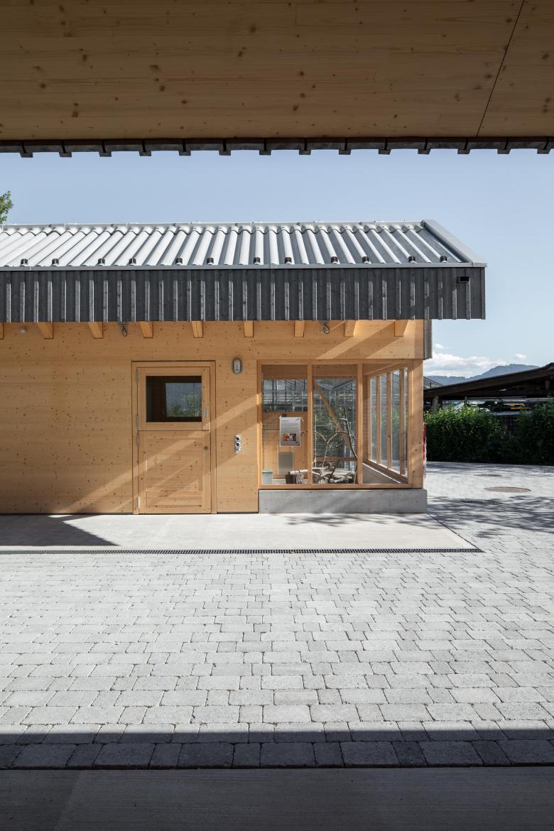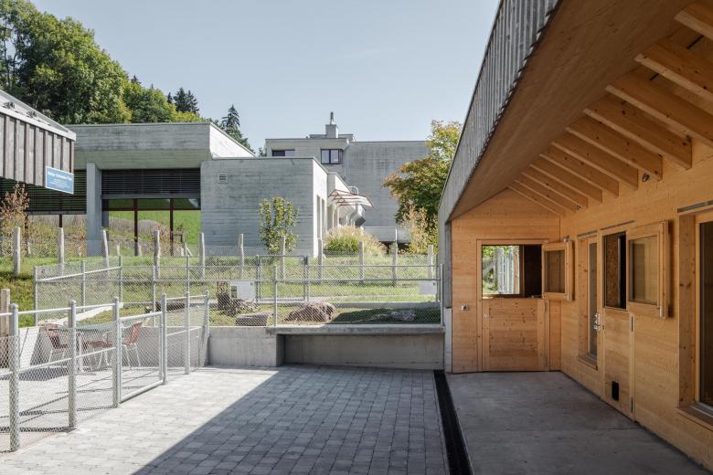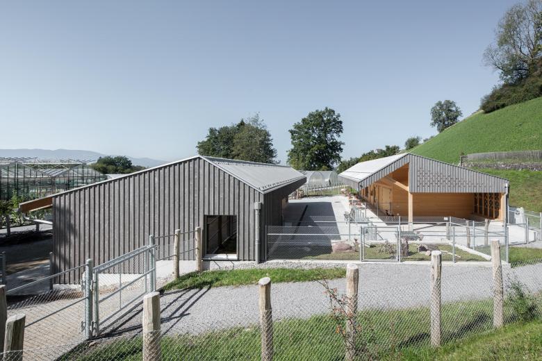 Zwei Holzbauten bilden ein bauernhofartiges Ensemble. Die Anordnung der Baukörper parallel zum Hang folgt dem Konzept des bestehenden Campus aus den 70er Jahren. Die Ordnung zueinander verschobener, längs gerichteter Baukörper findet man auch in den Stützmauern im steilen Hang im Rücken der Anlage.