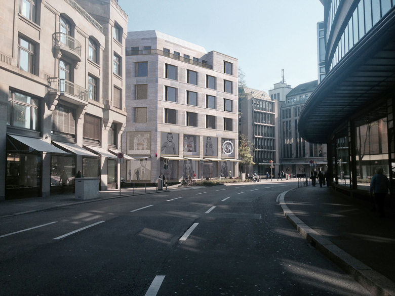 Unser Vorschlag baut die Fassade zurück auf die Struktur des Touring-Hotels. Darauf entsteht die neue, zeitgemässe städtische Fassade aus Naturstein (erneut in Travertin). Sie knüpft an die Tradition des Hauses an.
