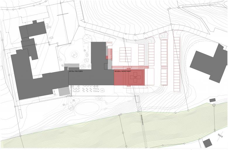 Der „Neubau Nordtrakt“ des Spital Frutigen und des Pflegeheim Frutigland zeichnet sich durch eine hohe Nutzungsflexibilität aus. Als kompakter, west-ost orientierter Annex ist er an den bestehenden Nordtrakt gebaut. Er entstand in Zusammenarbeit mit JFB-Architekten.