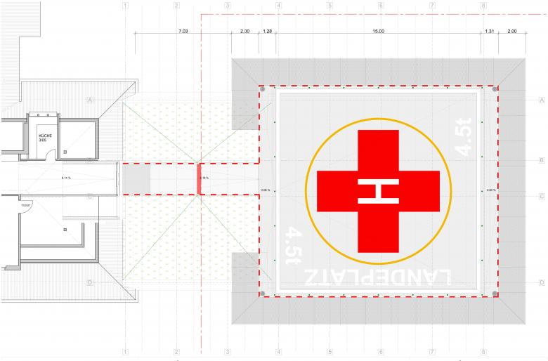 Die Dimensionen des neuen Gebäudeteils werden wesentlich durch die Anforderungen des Helilandeplatzes mitbestimmt. Insbesondere wurden ein sicheres Anflugregime und ein einfacher Patiententransport berücksichtigt.