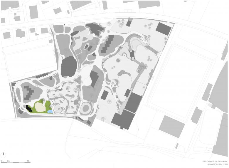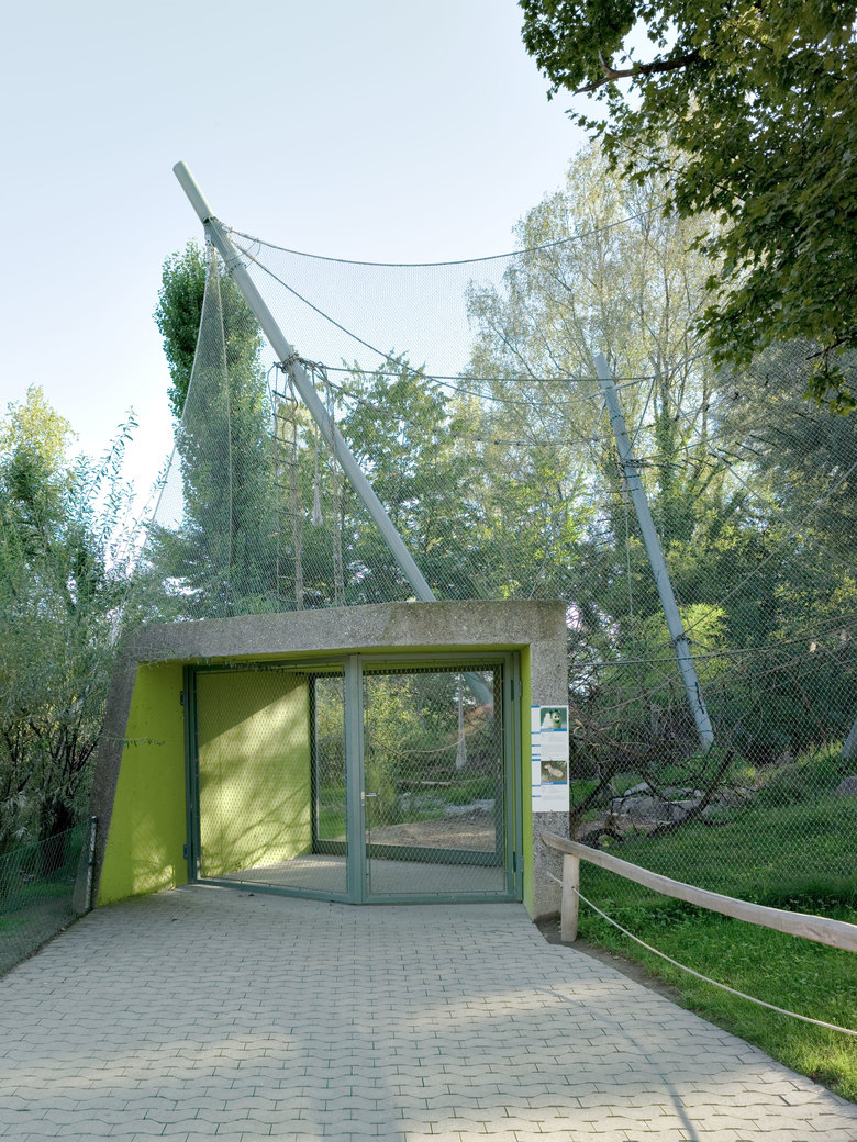Die hohe, schwungvolle Übernetzung der Totenkopfaffen-Anlage lockt die Besucher in den hintersten Bereich des Kinderzoos und verleiht dem ganzen Gebiet neues Leben. Die ausdrucksstarke Zeltform legt sich zwischen die bestehenden Bäume. Die Konstruktion besteht aus vier, schräg stehenden Stahlpylonen, über die ein Chromstahlnetz gespannt wird. Es ist gleichzeitig die erste Zooanlage mit dem Webnet der Firma Jakob AG.