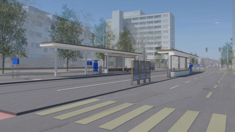 Zwei offene Wartehallen stehen sich gegenüber und spannen über die Tramgleise hinweg einen Raum auf. Ihre seitliche Abschlüsse beziehen sich aufeinander. Gemeinsam markieren sie das räumliche Zentrum des Zehntenhausplatzes. Für die Dauer der Umsteige- beziehungsweise Wartezeit wird durch das Zusammenspiel der beiden Hallen ein geschützter Aufenthaltsort mitten im pulsierenden Strassenverkehr gebildet – zwei Anlegestellen für Tram und Bus inmitten des steten Verkehrsflusses des MiV. In die jeweilige Fahrtrichtung des Verkehrs weiten sich die Perrondächer. Mit ihrer Länge von über 26.0 Metern schützen die ein- und umsteigenden Fahrgäste entlang der Haltekante zuverlässig vor der Witterung und versetzen die Haltestelle und den gesamten Platz in dynamische räumliche Bewegung.