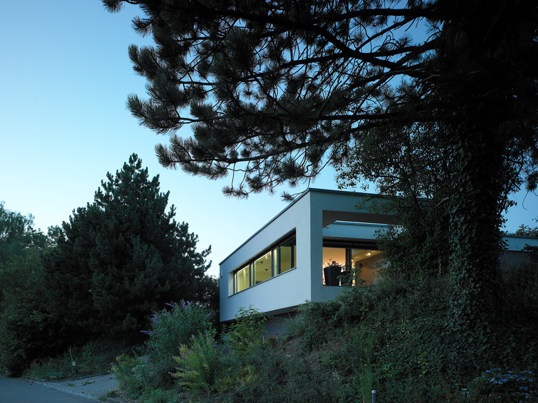 Neben diesen Anliegen verfolgten wir die Ziele, den Gartenbezug erlebbar zu machen, stärker zwischen öffentlicher und privater Seite zu unterscheiden und die bisher kaum erlebbare Aussicht zu thematisieren. Differenzierte Öffnungen im Osten, Süden und Westen des Volumens und die Offenheit der Anbindung der neuen Räume machten dies möglich. Die zugrundeliegende Raumabfolge Loggia – Wohnen – Gang – Büro – Loggia ergibt in West-Ost-Richtung eine Art Symmetrie, unter der sich alle weiteren Entscheide einordnen lassen. Auch die Fassadengestaltung folgt diesem Konzept: unter einem weissen Rahmen, der sich von Loggia zu Loggia spannt, steht der dunkel verputzte, beidseitig vollkommen offene „Wohnkörper“.