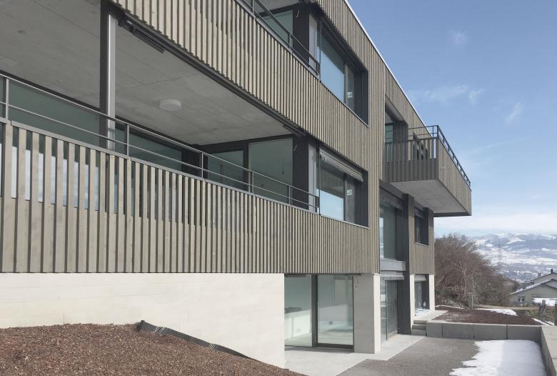 So entstanden zwei Häuser mit je fünf Wohnungen und einer gemeinsam genutzten Parkgarage. Die grosse Qualität an dieser Hanlage ist die grossartige Aussicht, von der jede Wohnung profitiert. Die Gestaltung von Erschliessung und Parkierung ist hingegen – lagebedingt – als anspruchsvoll zu bezeichnen. Das eine Wohnhaus ist von der unteren Zufahrtsstrasse her erschlossen, während andere Haus von der oberen, hangseitigen Strasse erreicht wird. Über eine Promenade Architecturale werden sie miteinadner verbunden, so dass man trockenen Fusses - ohne Treppen laufen zu müssen – von der Einstellhalle des unteren Hauses bis in die Attikawohnung des oberen Hauses gelangt. Die Mietwohnungen sind klassisch geschnitten und zwischen 100 und 150 Quadratmeter gross. Damit man von jedem Zimmer aus die See- oder Bergsicht genissen kann, wurde der Erschliessungskern an die Nord- und Hangseite gelegt. Etwas Besonderes sind die grosszügigen Terrassen, welche jeweils um die ganze Wohnung herumführen und über welche praktisch jede Wohnung einen direkten Gartenzugang erhält – ein weiterer Vorteil der Hanglage.