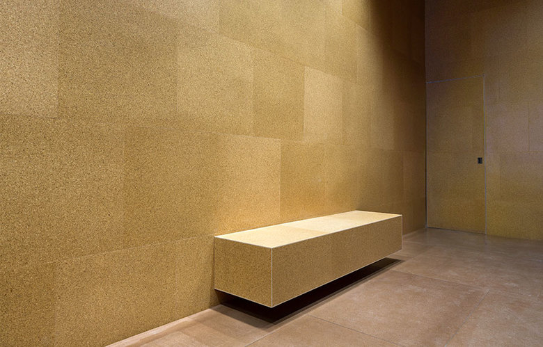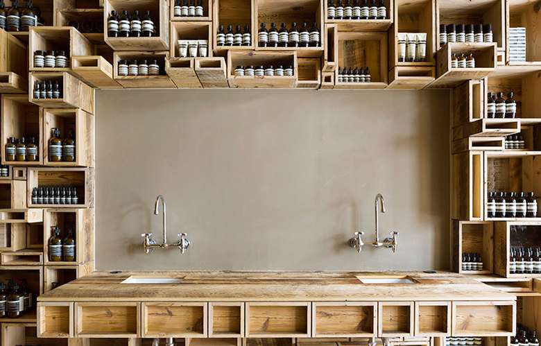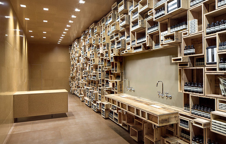 The opposing wall is clad in cork--pure, seamless and unfettered by any intricacy. Using the strict repetitive organization of the Aesop bottle-- a leitmotif of the brand-- the random stacking of boxes acts to downplay the regimented nature of the brand.