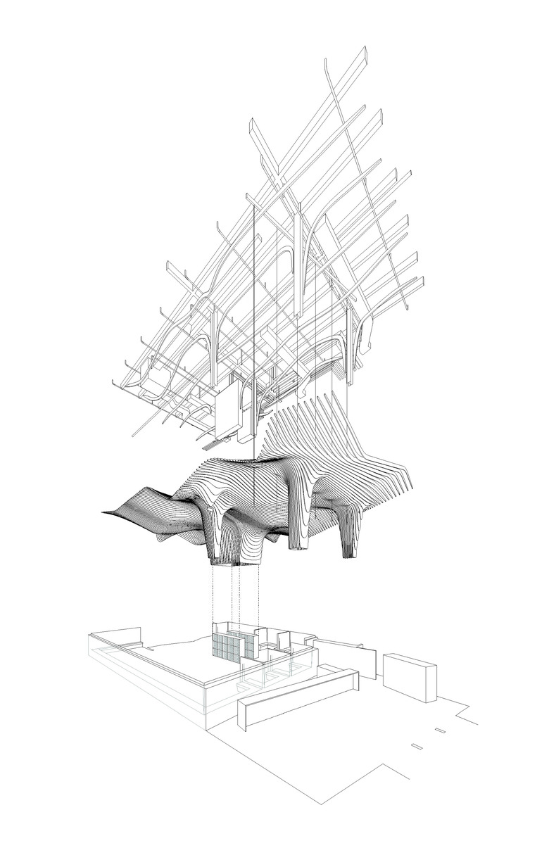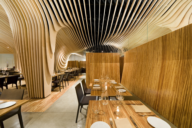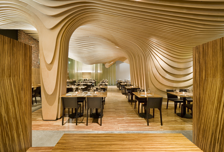 Thus, the entire ceiling is covered by a wood-slatted system that encases and conceals the inherited systems, while offering a large canopy under which to dine. The wood slats are designed as a landscape, undulating in relation to the very equipment they conceal overhead, while encasing the columns in the main hall. The wine storage, in the middle of the hall, serves as another point of support for the ceiling, and acts as a monumental trunk, keeping the canopy aloft. Divided into two segments, the front area on Washington Street is programmed as a bar, while the larger hall behind serves as the dining area. An axial view from the street produces the proscenium from which to view the canopy while lateral views give hints of the structural and mechanical devices being concealed.