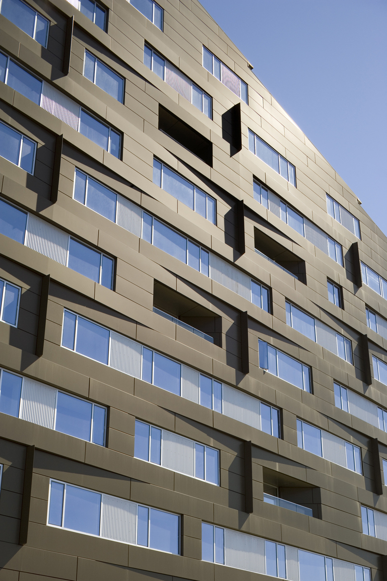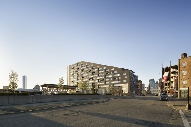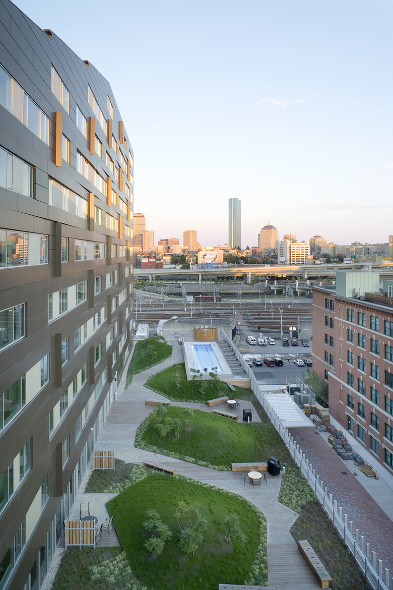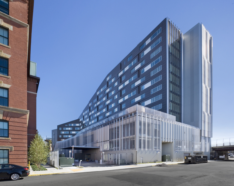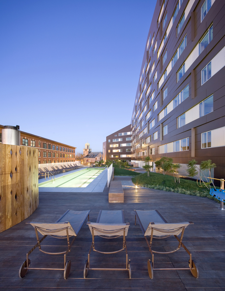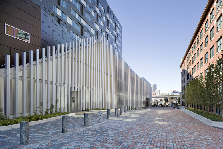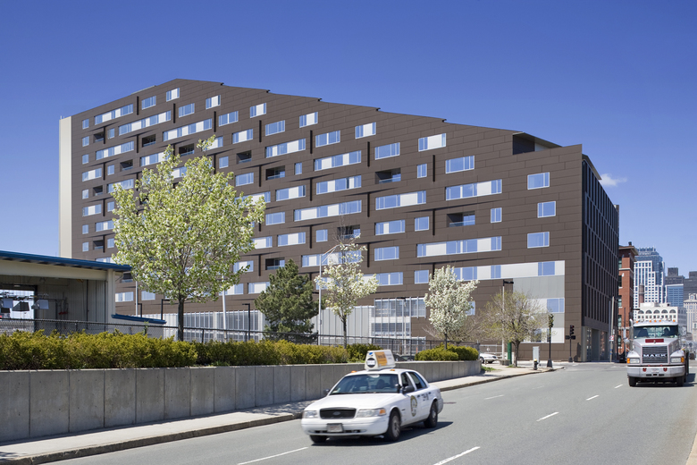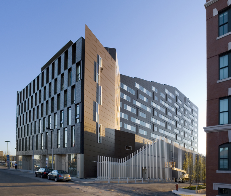 As a pivotal building in the urban revitalization of South Boston, the Macallen Building’s design requires a reassessment of conventional residential typologies to produce an innovative building that works within a developer’s financially competitive budget.  Occupying a transitional site that mediates between highway off-ramps, an old residential fabric, and an industrial zone, the building negotiates different scales and urban configurations.  The design addresses two scales and the different edge conditions of the surrounding context through varied spatial conditions, various ways of reacting to the public sphere, and accompanying material and façade articulations to reinforce the scales of interaction.  On the western end, the building responds to the highway with a curtain wall yielding panoramic views for the residents inside the building.  On the eastern end, brickwork mirrors that of the residential building fabric, extending the logic of the storefront and pedestrian scale elements on that facade.  On the north and south facades, bronzed aluminum panels reflect the industrial neighborhood component and express the structural system organization.  Additionally, the Macallen building was designed from the ground up to take advantage of “green” building techniques and materials.  It is the first LEED certified building of its type in Boston.