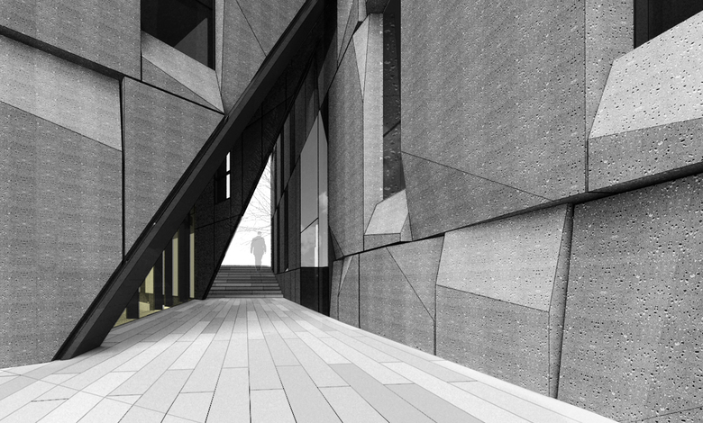 Clad in a local stone, the buildings have a pumice-like roughness which contrasts directly with the delicacy of entries and openings once they are revealed through the carefully controlled “slicing” of the cubes. Panels of stone are arrayed on the facade, producing a language of rhythmic openings, which themselves become part of a more finely grained differentiation of workspaces.