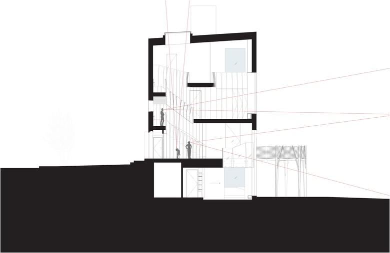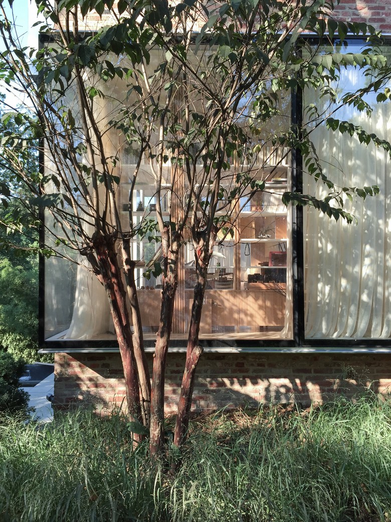 The perimeter structural wall, composed of brick, is reorganized around a north-south bias to mark the axial transition of formal and closed spaces on the north, to the informal and exposed spaces of the south. In correspondence to this, internal structural framing runs east-west, connecting the brick party walls, while topped with a cladding of laminated plywood that serves the program of the house, running north-south in tandem with the orientation of the house. All elements are incorporated into these laminar striations: stairs, closets, seats, window frames, among other components. From a solid facade on the North to a transparent and glazed facade to the south, the tectonics of the house reinforces this transformation.