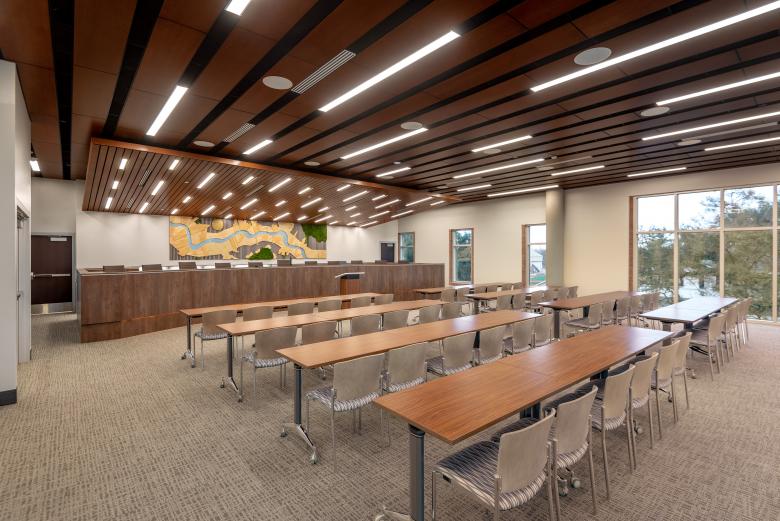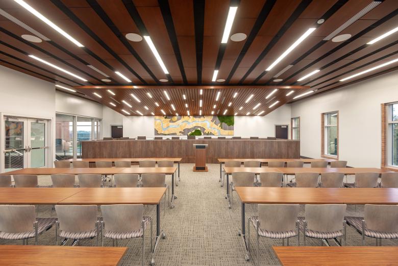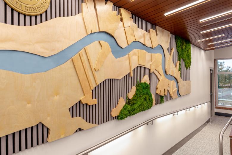 Located along the Mississippi River in Reserve, Louisiana, the Port of South Louisiana’s new three-story headquarters consists of a covered parking lot, administrative and support spaces, conference rooms, collaborative break out spaces, and various state-of-the-art employee offices with uninterrupted views of the river. NANO was hired by Meyer Engineers to oversee all interior design and FF&E selection, in addition to designing a highly-unique and custom wall feature for the 2,100 SF boardroom.