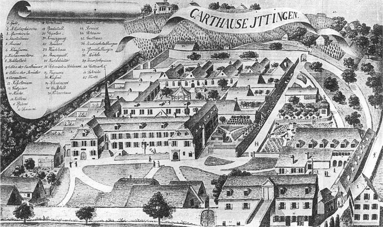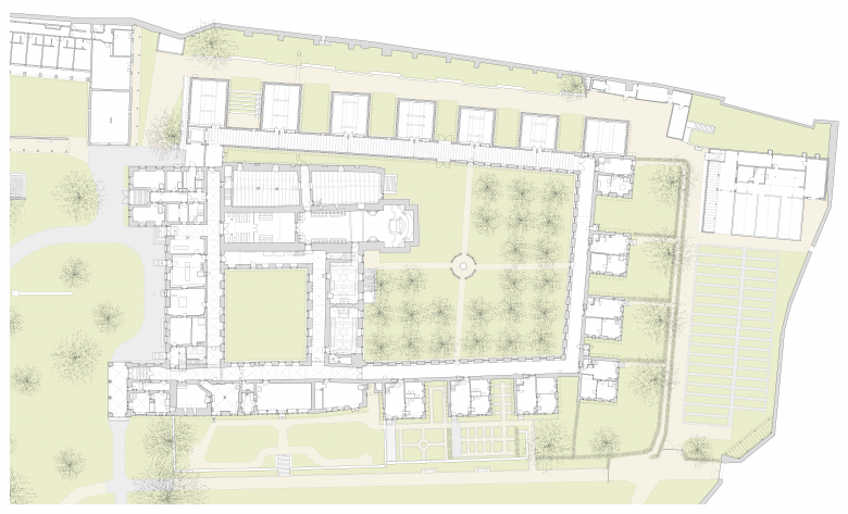 Die äussere Gestalt der geschützten Originalsubstanz bleibt wesentlich unverändert. Dies gilt vor allem für das Portal am Westflügel, das schmuckvoll ausgeprägt nicht nur selbstverständlich den logischen Hauptzugang zu den heutigen Museen manifestiert, sondern gleichzeitig in dessen Verlängerung den historisch betrachtet bedeut- samen Zugang zur Klosterkirche ankündigt – dem kostba- ren Prunkstück der Klosteranlage. Als wegweisende Massnahme sollen die Klausen XIII und XIV mitsamt der Unterkellerung und ein Teil des Nord- kreuzgangs zurück- gebaut werden. Dadurch kann der räumliche Abschluss des Nordkreuzgangs und die Anbindung an den Nord- risalit stärker ausgeprägt werden. An der Chatakteristik der bescheiden geformten Raumzugängen – ausgehend von den Kreuzgängen als prägendes Wegsystem in der Klosteranlage – wird aber mit aller Konsequenz festge- halten. Die Portale werden weder ver- grössert noch ver- edelt. Es wird das ständige Bauen, Erneuern und Aus- schmücken mit Bedacht in kleinen Schritten verfolgt, als naheliegende Fortsetzung der jahrhundertealten Tradi- tion getreu dem kartäusischen Grundsatz Stat crux dum volvitur orbis.