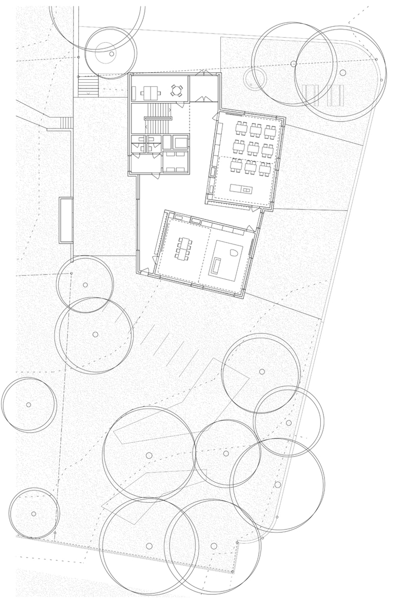 An dieser Stelle knüpft der Entwurf für den Ersatzneubau an. Das neue Gebäude grenzt im Norden unmittelbar an das Schulhaus-Plateau an und reiht sich als weiterer Solitär selbstverständlich in das bestehende, kompositorisch linear ausgerichtete Ensemble der Schulanlage ein. Zusammen mit den nördlich gelegenen Wohnhäusern wird die Begrenzung des Plateaus durch die Setzung des Hortgebäudes an dieser Stelle verstärkt. Gleichzeitig bleibt der eigenständige, quartiertypische Grünraum mit wertvollem Baumbestand, welcher durch den „kleinen“ Gebäudeabdruck nur geringfügig tangiert wird, bestehen.